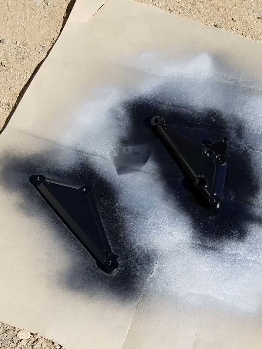 After multiple attempts to paint the rear footpeg brackets two tone (like stock), I threw in the towel and blacked them out. Single color is so much easier.