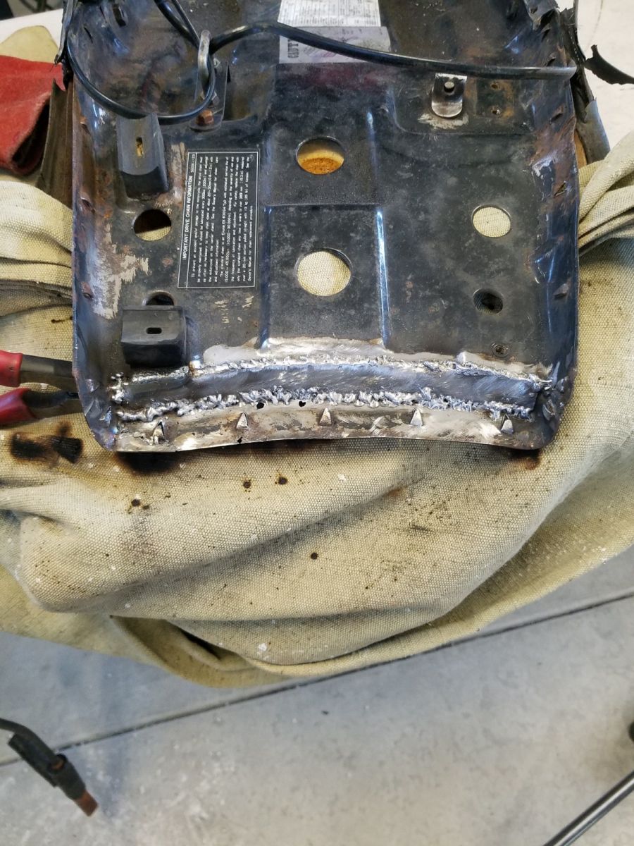 I ended up having to add a strip of steel sheet to the front of the seat pan to repair rusted through metal. I wish I learned how to TIG weld! Using a MIG welder for thin sheet is difficult at best, so don't critique too harshly. Some painting and clean up and it will ready for the upholstery.