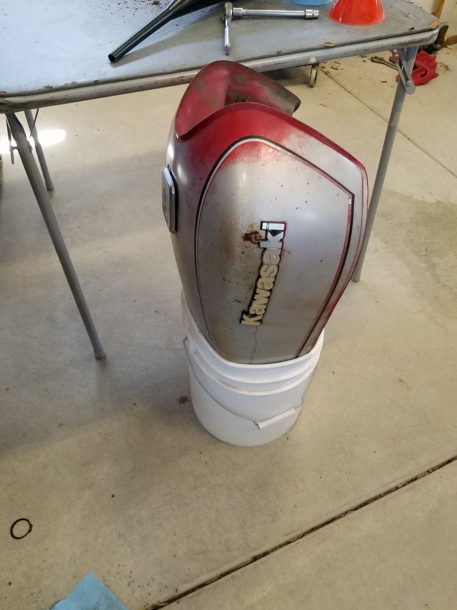 I love the fact that the shape of the tank works great with a 5 gal bucket! My sophisticated leak containment system. The old petcock o-ring is seeping a little. The gas cap leaks a lot, so I will pick up an expanding rubber plug for when it gets flipped over for the other half. I put about 3 gallons in it, so it will be above the soak line. This tank is about 4.5 gal capacity.