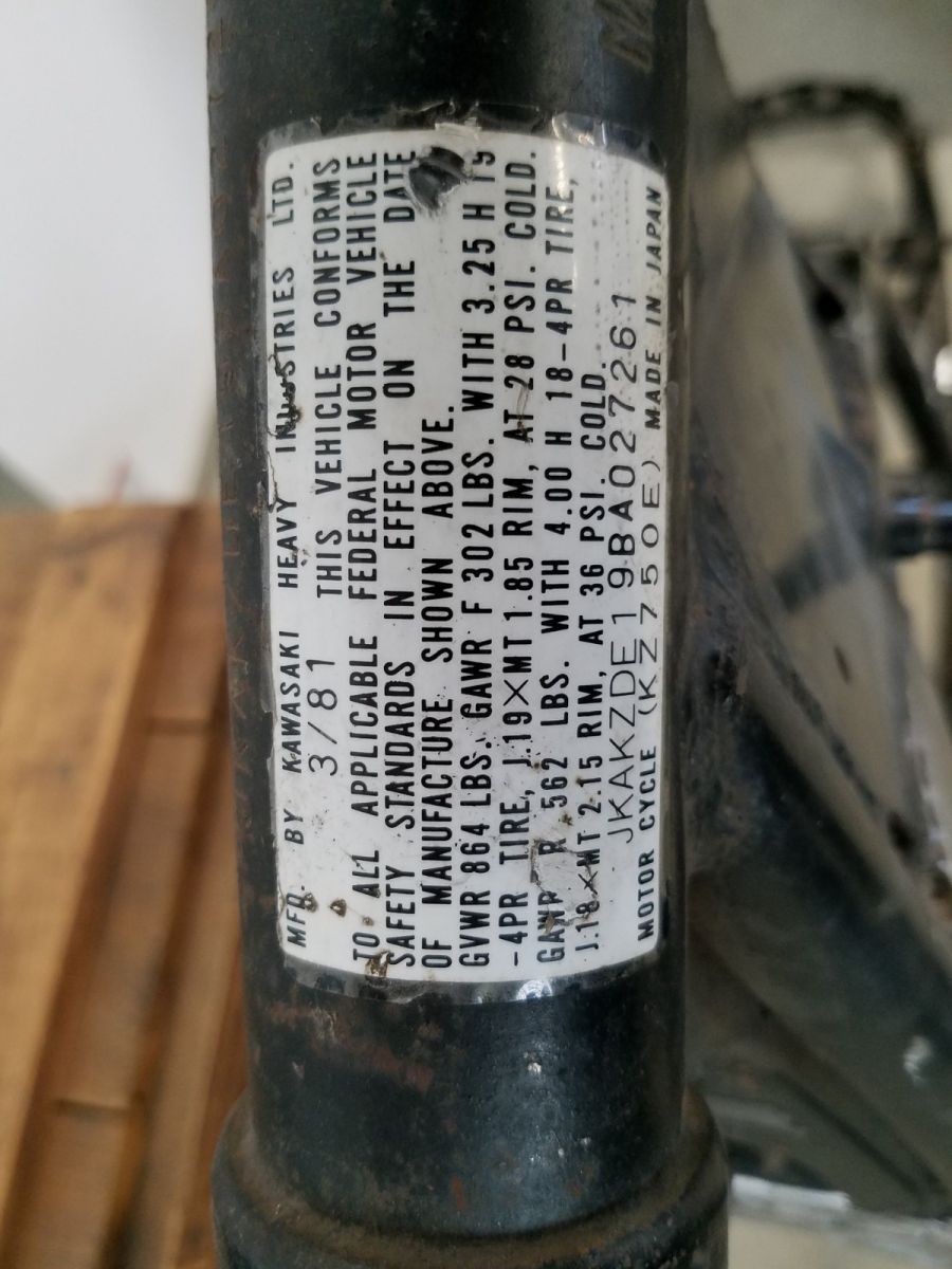 The 1981 KZ750-E2 wiring diagram in the shop manual I purchased online shows the low fuel sensor, but the sticker on the frame head says E1. They must have been using up the old run of stickers at this point in the serial number run.
