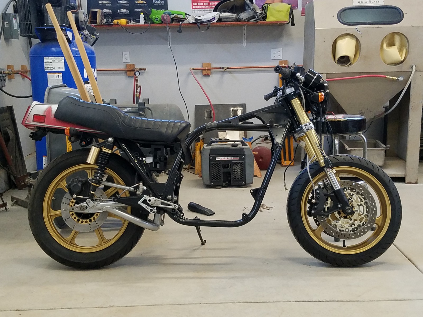 Got bit by the spring cleaning bug today since the tank welding is taking a bit longer than the welder thought it would. I actually rolled the bike of the stand for the first time! The bike lift got a thorough wipe down and cleaning. I'm really liking how the stance is coming out. It will change when the motor goes in, but I am liking the new rake.