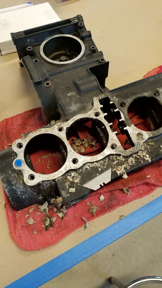 The oil pan gasket should be easier to remove than the base gasket. Once I have that surface clean, I can start to tape off the sealing surfaces and start bolting it back together. I will use the old spark plugs to plug the head, stuff rags in the intake and exhaust ports, and tape those off as well. The cylinder block and head are already clean and ready for paint, so those won't get a direct blast while in the cabinet. Just the lower cases and covers.