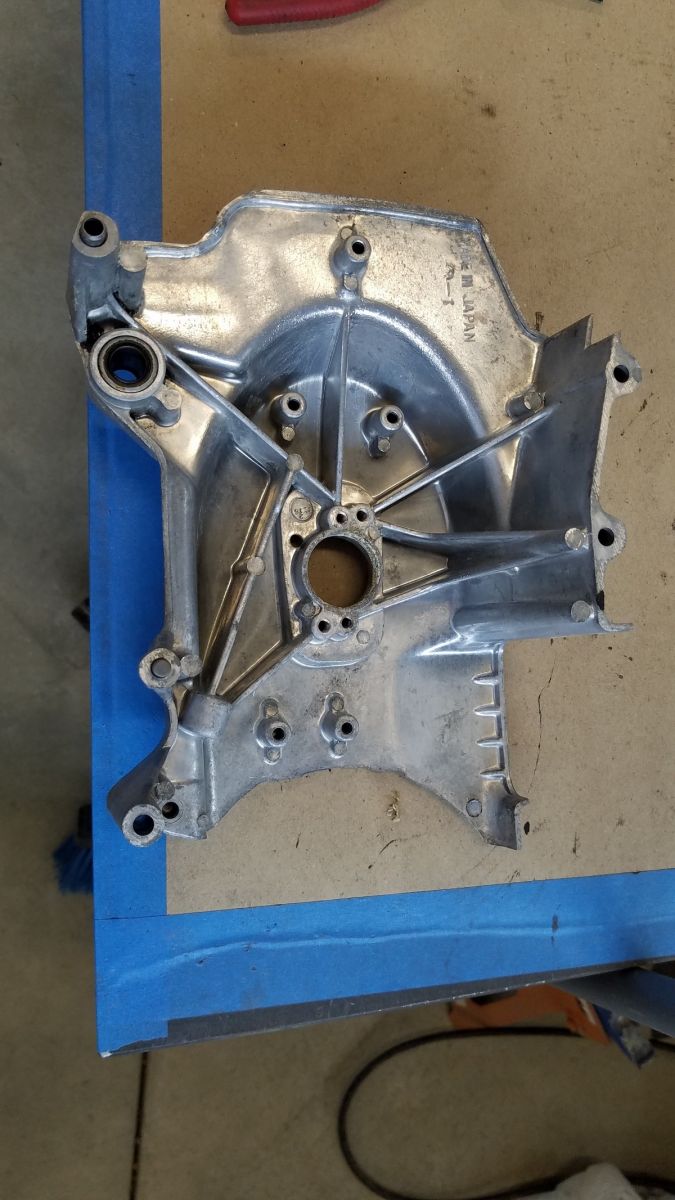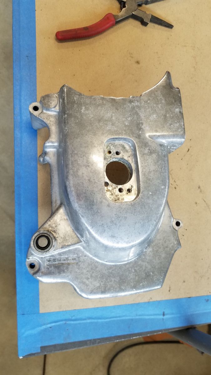 The case cover for the countershaft sprocket was really hard to clean. After getting 90% of the crap off the inside, i decided to put it in my bucket of Evapo Rust even though it's aluminum. I wasn't sure how it would do with old chain lube and road grime. 48 hour soak, water rinse. Wow! Didn't expect it to come out this clean...