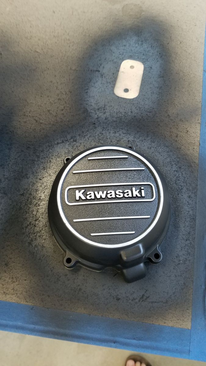The clutch cover did not come out very well since the corrosion caused some pitting. After the semigloss black paint I am not happy with it. So it will go back in the blast cabinet for stripping. I will probably end up with some type of filler for the pitting, and repaint it after sanding it smooth.
