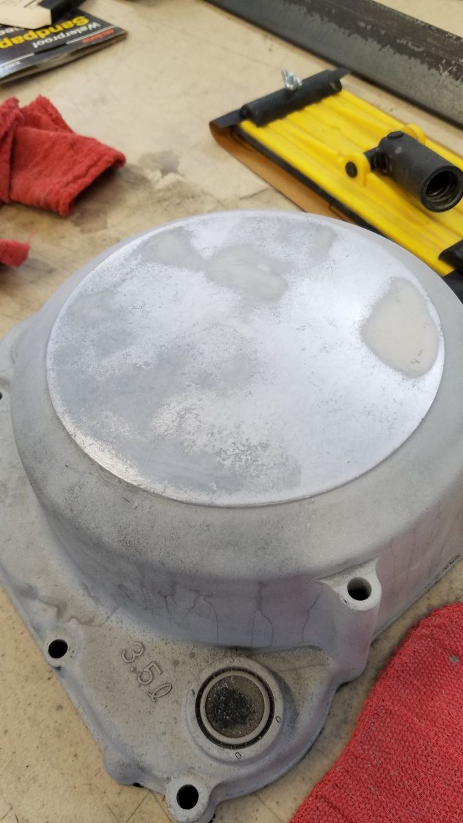 Back at it after a trip to the east coast for a week. Before I left, I applied the Permatex Liquid Metal filler so it would have plenty of cure time. I tried sanding it down today and did not get very good results. I am altering my application method since this stuff starts to harden very quickly when exposed to air. It is a thinner liquid than I was expecting, but cures really quickly. After cleaning the entire surface, I started to fill and smooth small areas at a time. This looks like it will sand down much smoother. I will give it another day or two and try another sanding. I am going to use a finer grit paper this time around as well.