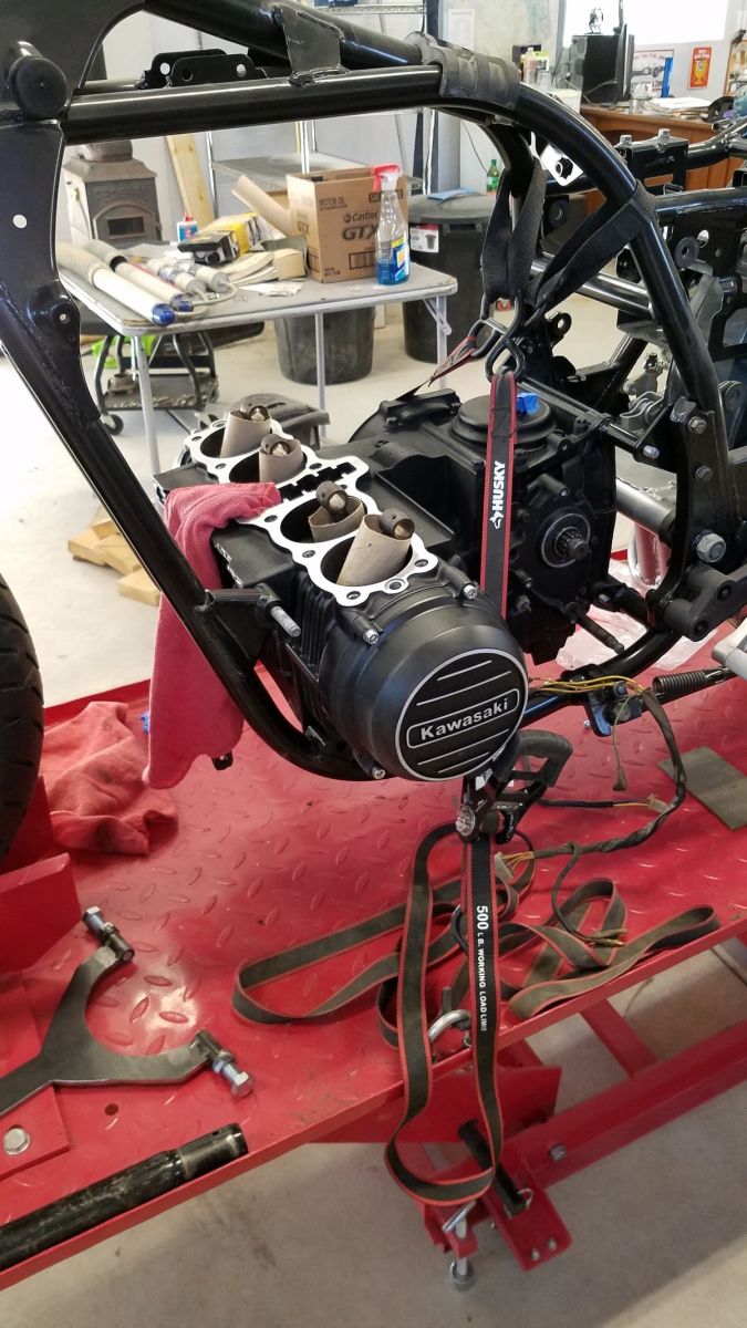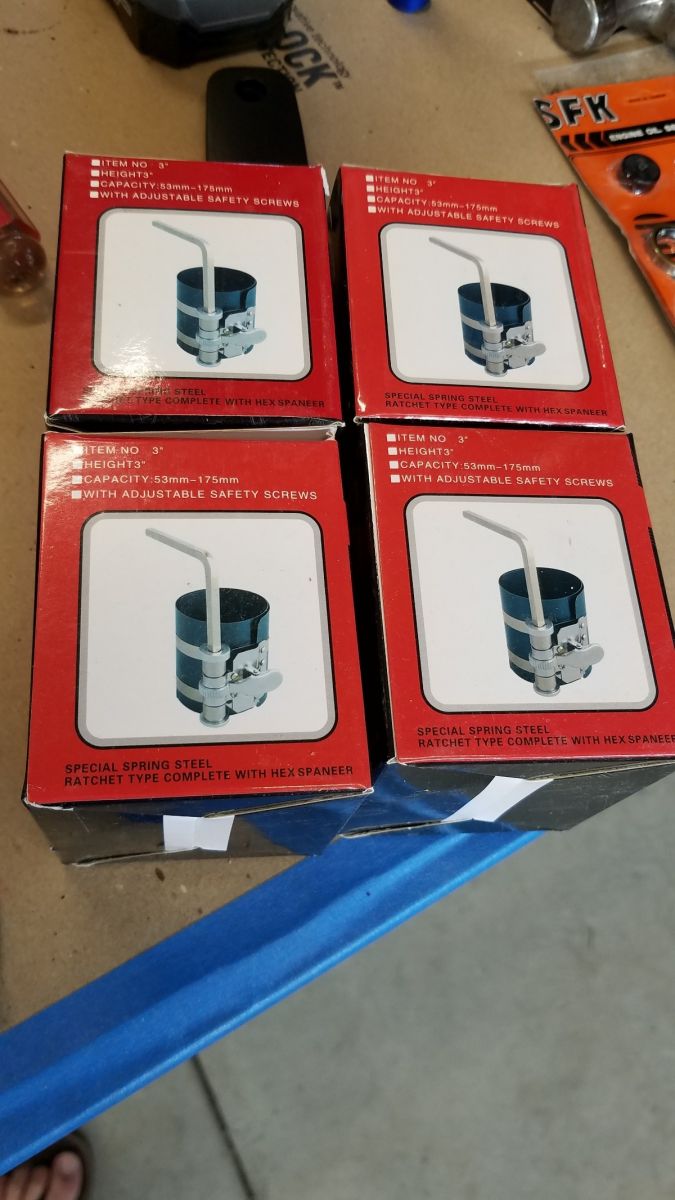 I have a feeling your ring compressors are not going to work out. Don't think you will have the room to use them. If you don't have the fancy Kawasaki ring compressor tool, you do two pistons at a time.