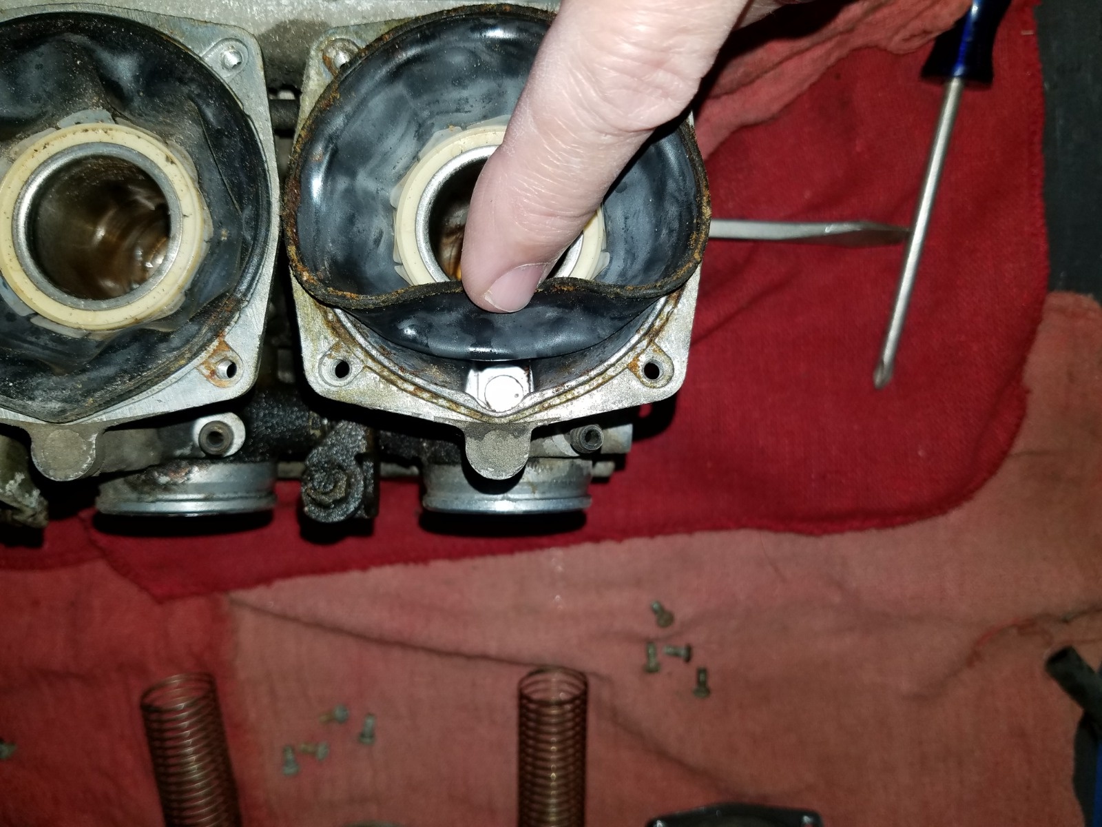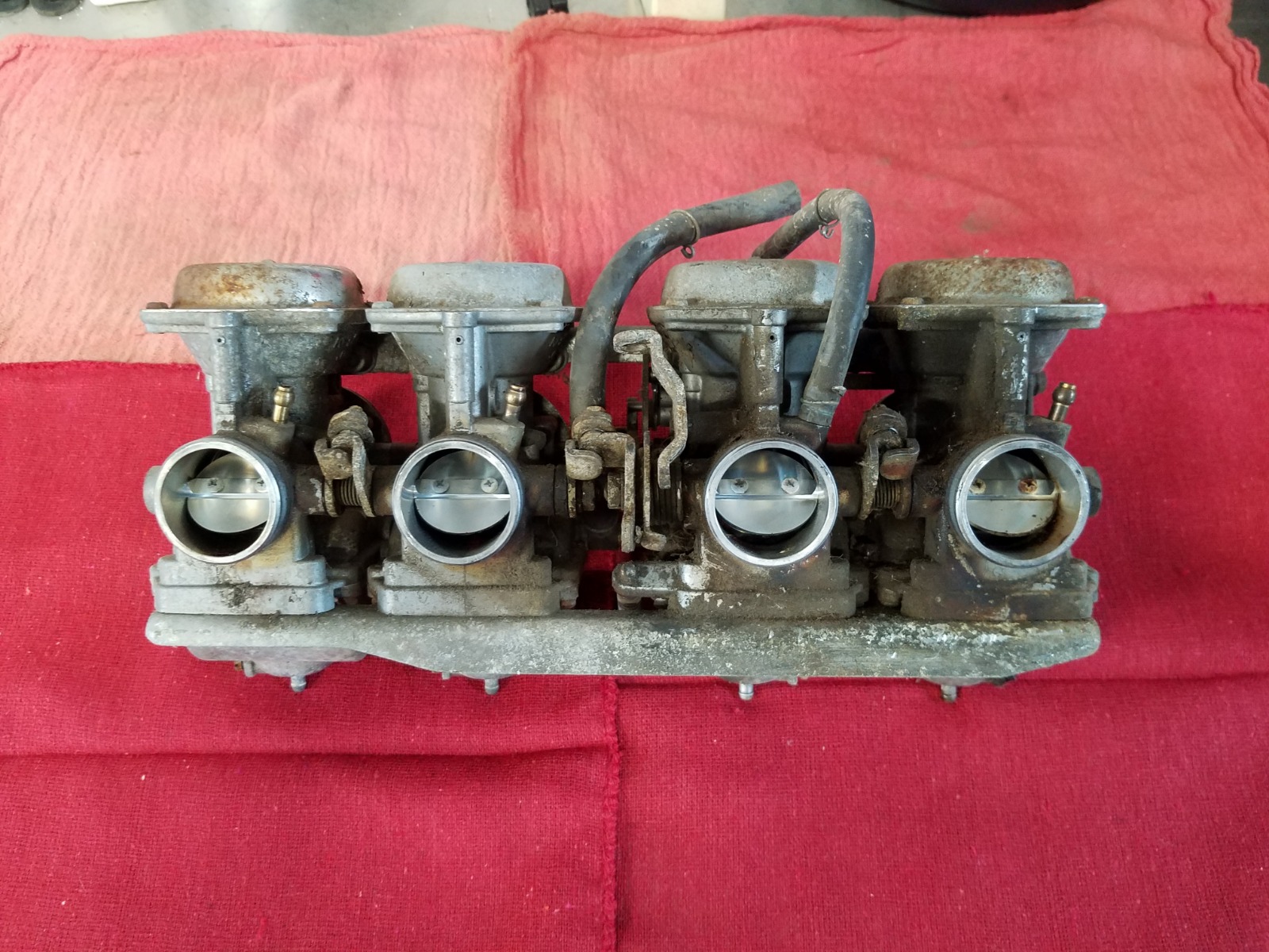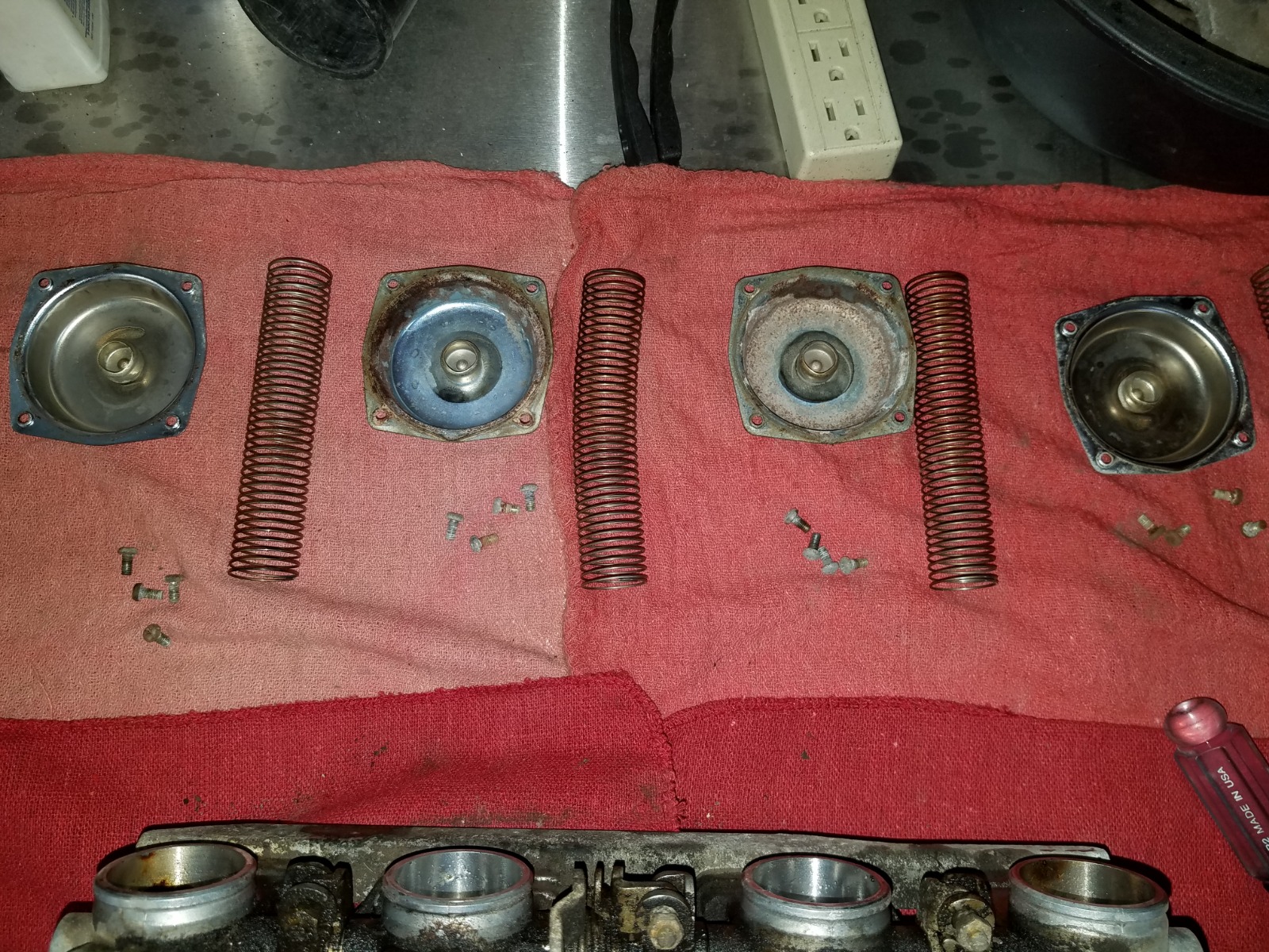 I finally started looking at the carburetors today. With some WD40 I was able to get the choke and throttle shafts moving again. Decided to get the vacuum pistons out and see how the diaphragms are looking. All the pistons were frozen in place. After liberal quantities of WD40, I was able to get 3 of the 4 out. Both outers were more difficult, with one of them being the last remaining. I hope I am up to the task of saving these!