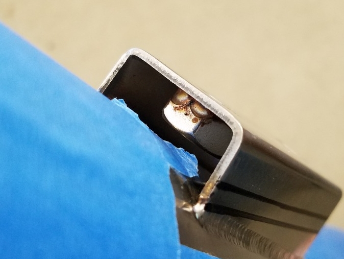 In a game of inches, or fractions thereof, take what you can. For starters I can make another 3/8" or so by moving the mount bracket closer to the muffler. Two cuts on each side, the weld it back on. All taped and marked up, ready to cut and weld. I will gain more room by bending the bracket that bolts to the footpeg bracket. I can only go so far before the nut contacts the muffler body. I may put a strategic dent in the muffler to recess the nut farther to gain a little more space.