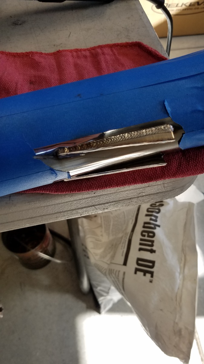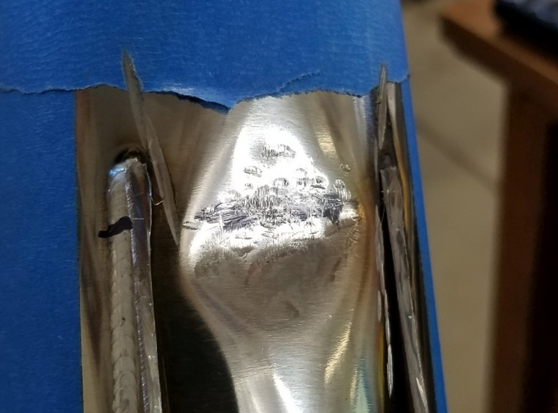 Here I am, trying to be careful. Those unwanted nicks will get weld beads when the bracket is welded back on. Glad it's on the inside of the muffler.