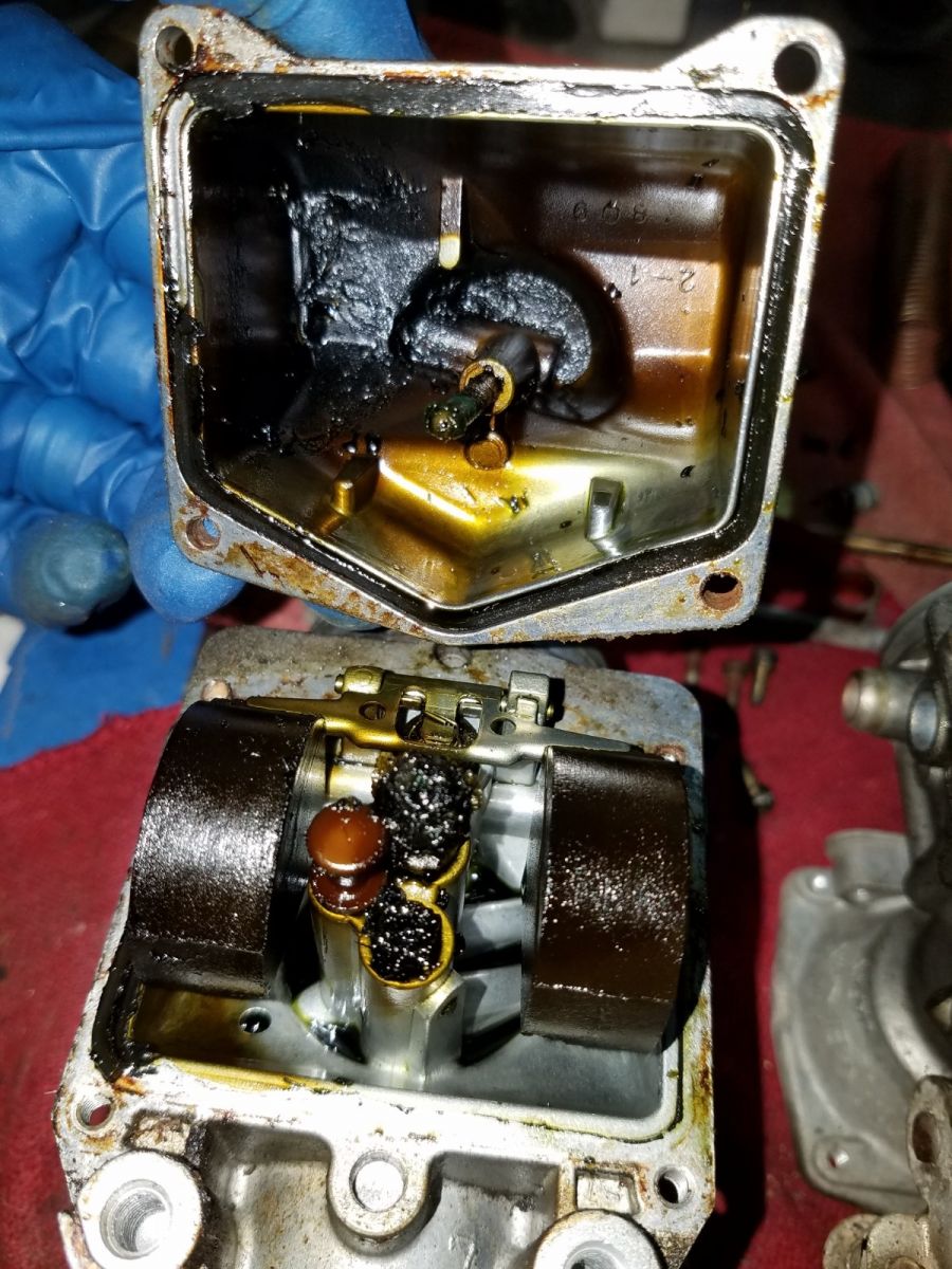 If anyone wonders what happens to gasoline after sitting for 28 years, here is your answer! Getting the float bowl screws out has been the most difficult part so far. 16 possible points, final score - Skidmark =14, float bowl screws =2. At least one broke above the sealing surface, so I won't have to drill it out. The other broke flush. Bummer. This was after soaking with penetrating oil.