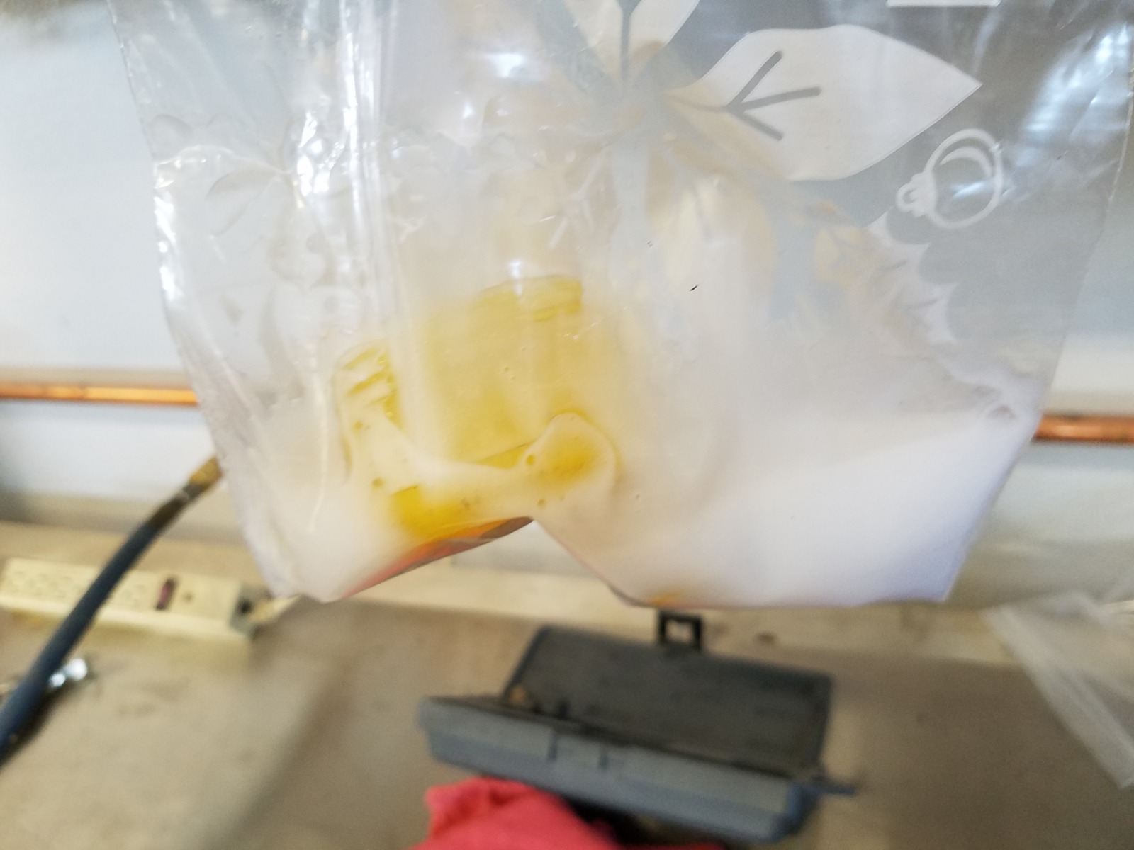 Who thinks up trying a hair product on yellowed plastic for the first time? Worth a shot. Here is the rear m/c reservoir marinating in Salon 40.