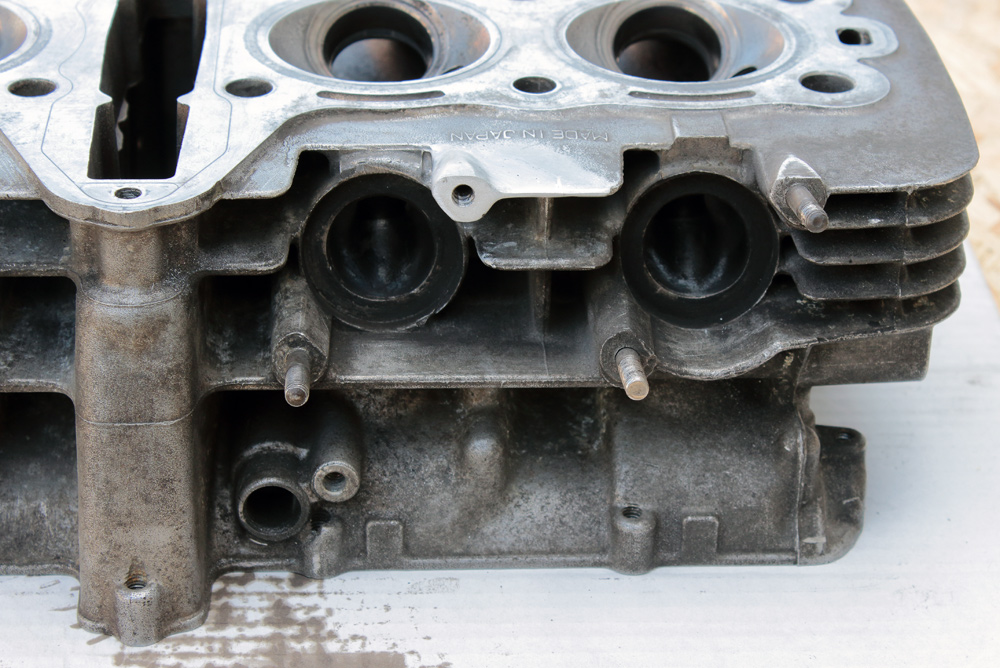 Initially I thought to use original KZ650 cylinder head as it was in very nice condition: no broken cooling fins, clean intake channels and so on and so forth. The only thing I had to fix was one of exhaust studs that was torn out with a small piece of cylinder head as well.