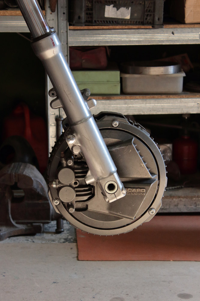Honda manufactured bikes with “inboard ventilated disc” brake systems of few different configurations until the end of 1980s when they gave up their position to classic brake disc systems. The most impressive representative of motorcycles with “inboard ventilated disc” brake system was CBX550. It has this system for both, front and rear brakes and moreover, there are two brake discs in front. Thus, both its wheels looked like direct descendant of 1960s-1970s Moto GP brakes, if we discard the fact that they were not spoked, but Comstar wheels. Sure, once I noticed CBX550 wheels I couldn’t help but thinking about using them in Kawasaki KZ650 project.