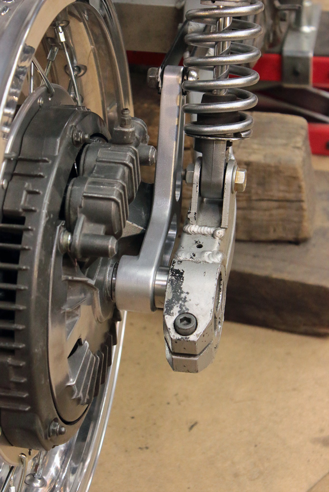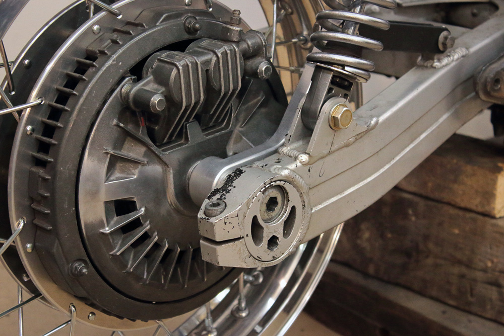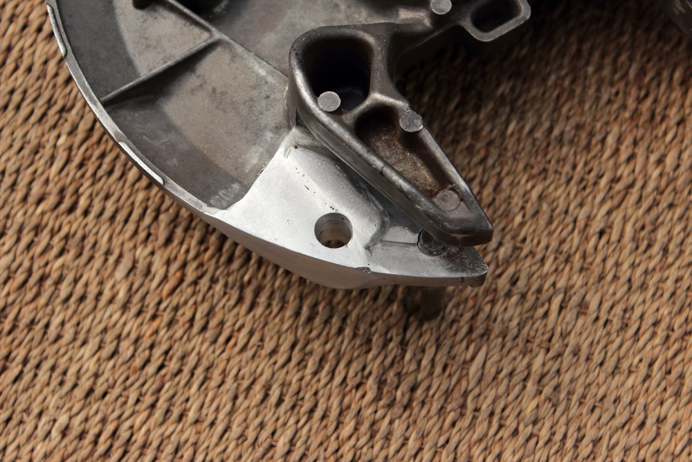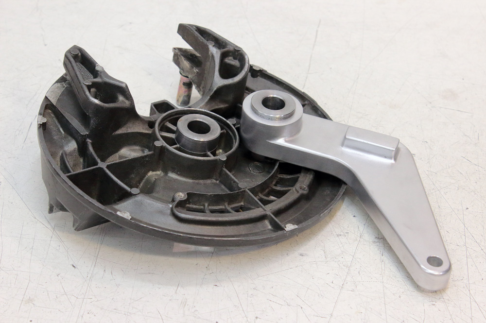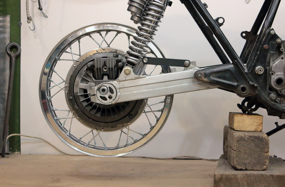 This time using of swingarm with eccentric chain adjusters made things a bit more complicated, as Honda CBX550 rear wheel is designed for swingarms with linear adjusters And what is most significant, in case of CBX550 wheel the very brake shield works as brake caliper bracket, thus it couldn’t be replaced with any other bracket.