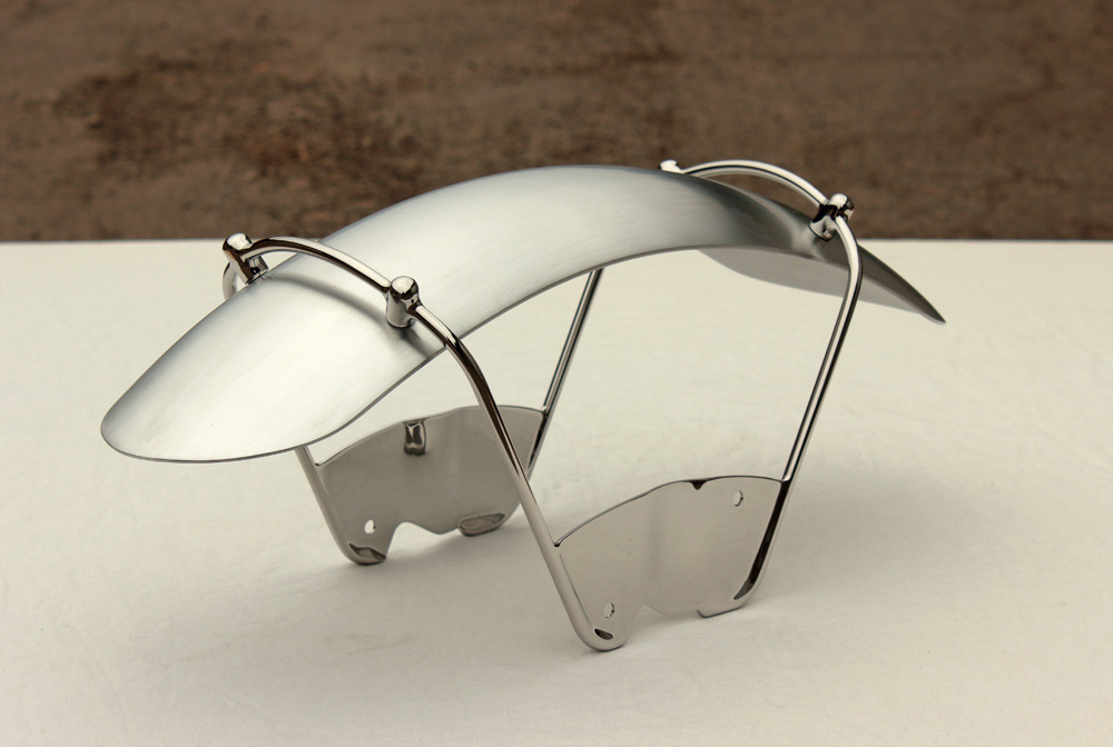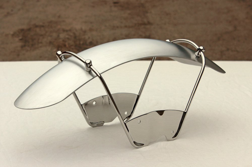 I could polish fender itself into the mirror as I did with its mount, yet with my intention to polish outer tubes of front fork and front wheel being already polished it would be “touch too much”. So, whatever the final finish of fender might be, now it’s “brushed aluminum”. For one thing, with this finish I could clearly see that I left no flaws and for another, combination of brushed aluminum and polished stainless steel looks stunning, both in real life and on the photos: