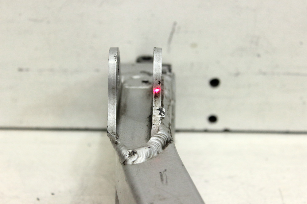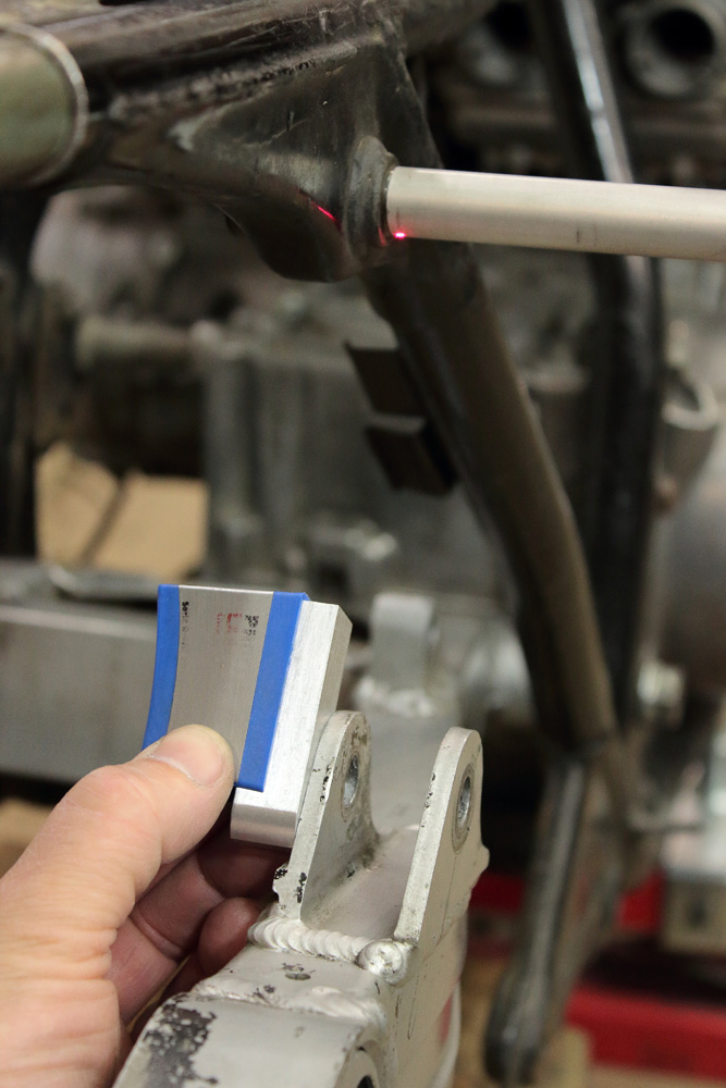 My next task was to check how shocks’ mounts on swingarm match shocks’ mounts on frame. Here I had no choice, but use shock mounts on swingarm as base for laser tool. To decrease influence of fact that mounts might be not strictly perpendicular to swingarm’ sleeve I decreased distance between upper and lower mounts: