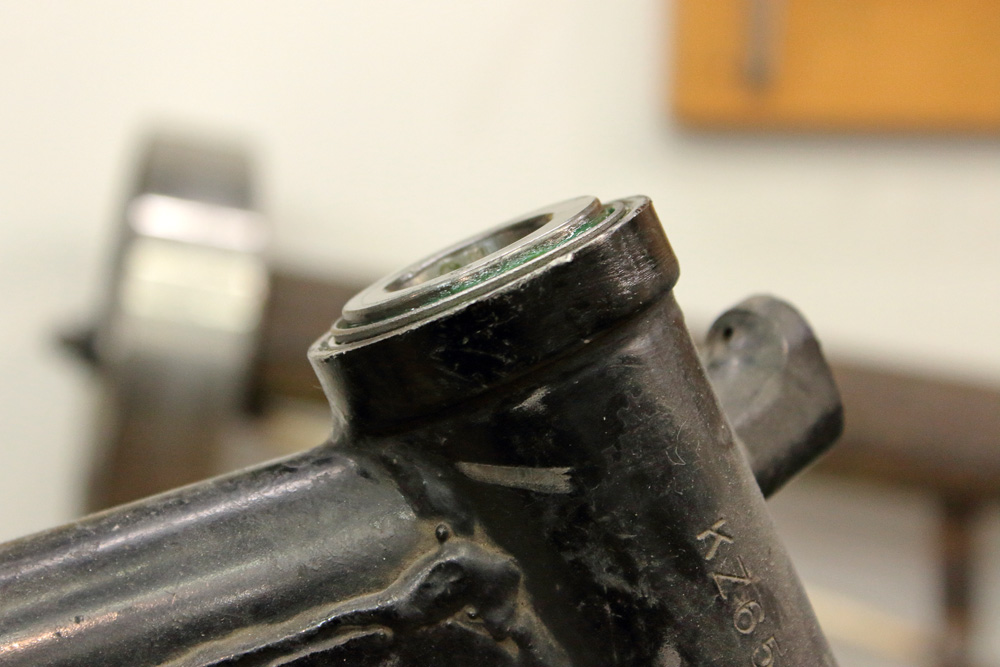 For this purpose I picked steering head cup from Yamaha XJ550 which perfectly fit Kawasaki KZ650 steering head. It sits there like it was made for it: