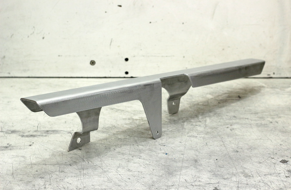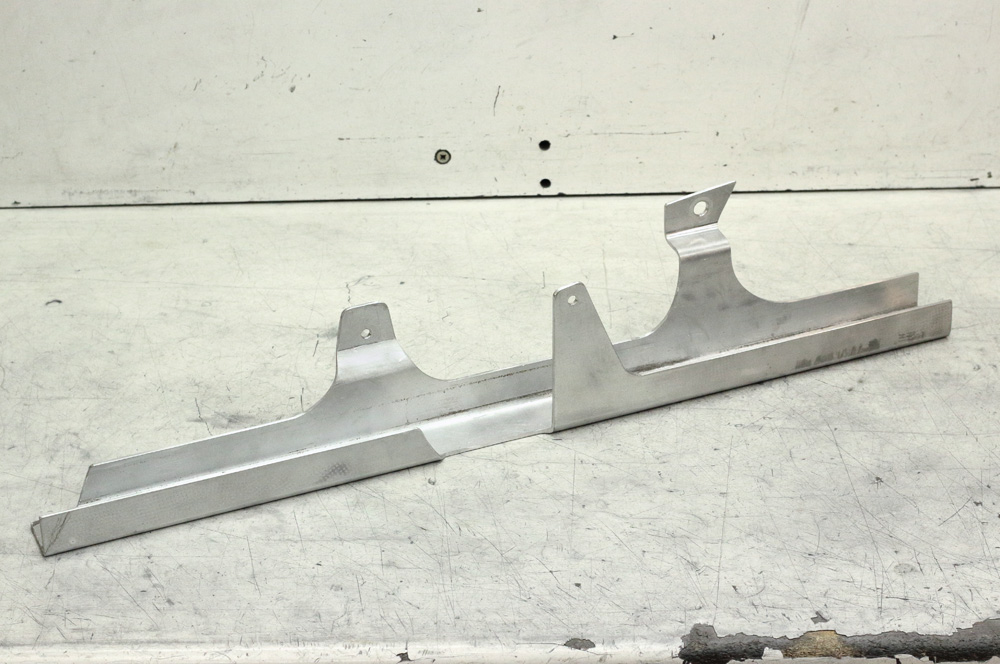 I solved an issue with inner chain guard mount simply by manufacturing new aluminum bracket. I made it of 6mm soft aluminum plate. Such alloy of aluminum might be bent without issues; however its’ softness is not the best characteristic when it comes to rigidity of construction. However, it’s well known, that soft alloys of aluminum might be strengthened by forging, or simply said, by hammering. To make whole business more OEM-looking I made improvised stamp and hammered groove from the welding seam up to bent. This groove completely solved issue of bracket stiffness.