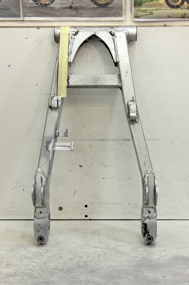 According to my plan, the swingram would be painted in black. But even now, when I seemingly finished with its modification, it would be unadvisable to glass blast it and paint it, so to cease my curiosity about its future look I painted swingarm with rattle can. I did it with swingarm as it was: not bothering with its sanding, just removed some flakes of old paint and cleaned the grease. So don’t take photos below as a final result, it’s nothing but modeling. And I should admit, that combination of polished aluminum of chain guard and black of swingarm made contraption slightly Star Wars’ looking. I already like it.