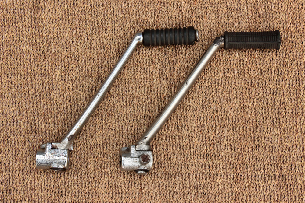 I’ve met opinion that older and newer kick pedals are of different configurations due to different mount of rider footpegs. However it’s not so. It so happened that I have both KZ650 kick pedals in my possession. Newer type came with KZ engine and older type I found to be installed on GS750 engine that in its turn was installed in KZ650 frame…
