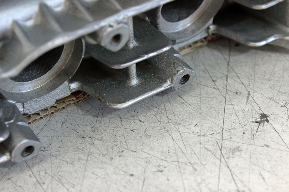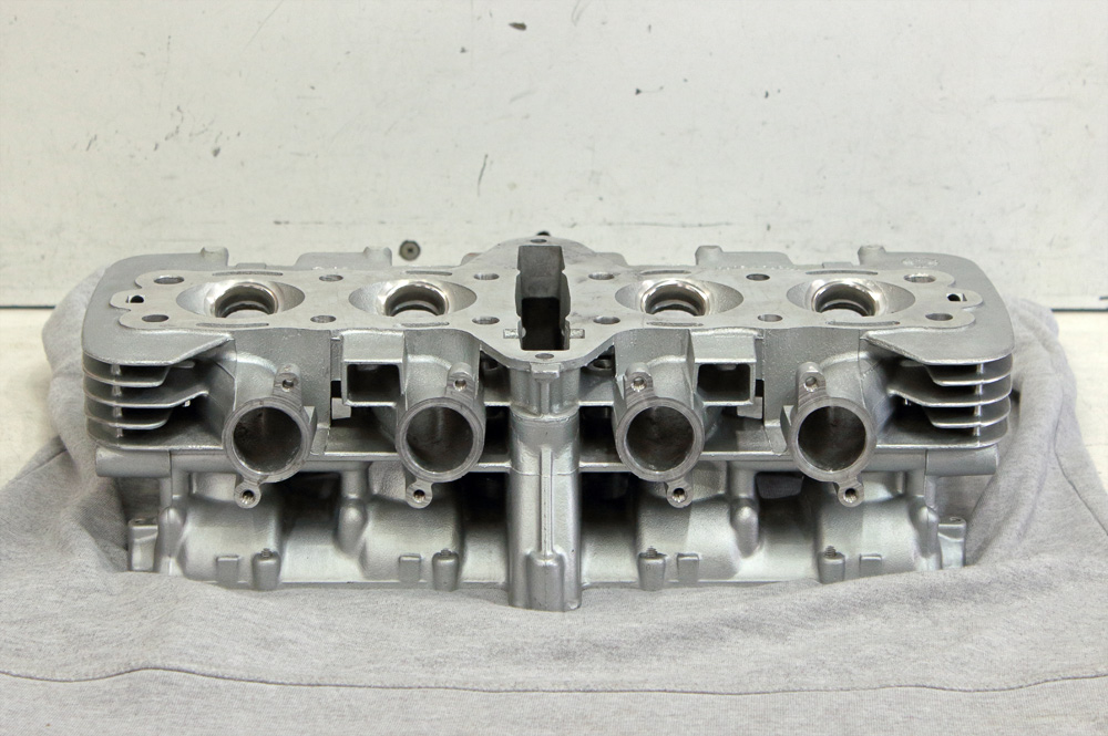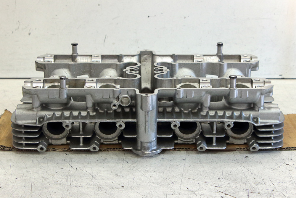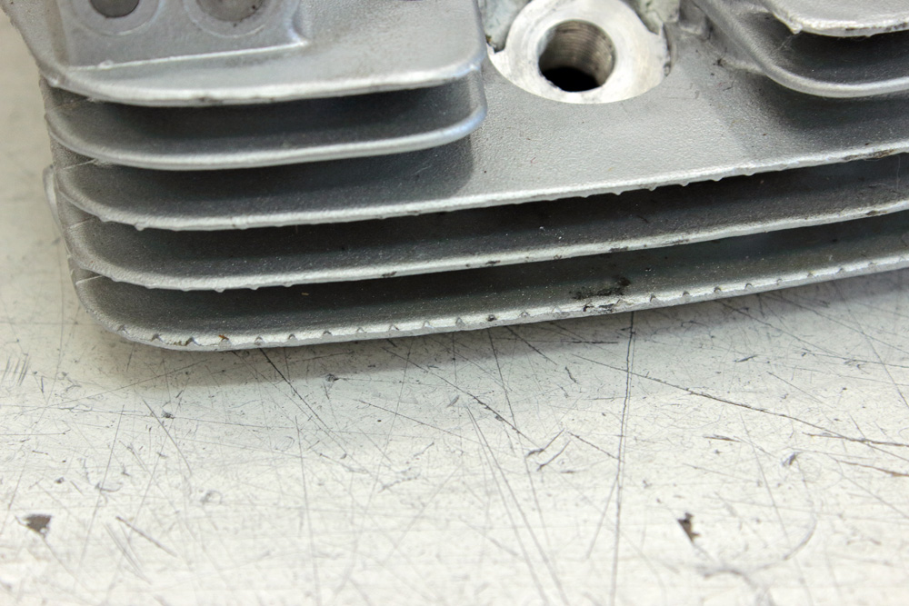 There were at least two modifications of an early Kawasaki KZ750 (or later KZ650) cylinder head. The early version was quite heavier, had very neat casting and its design was close to early KZ650 cylinder head. This cylinder head is of later model, so one may see traces of cast sprues on its cooling ribs: