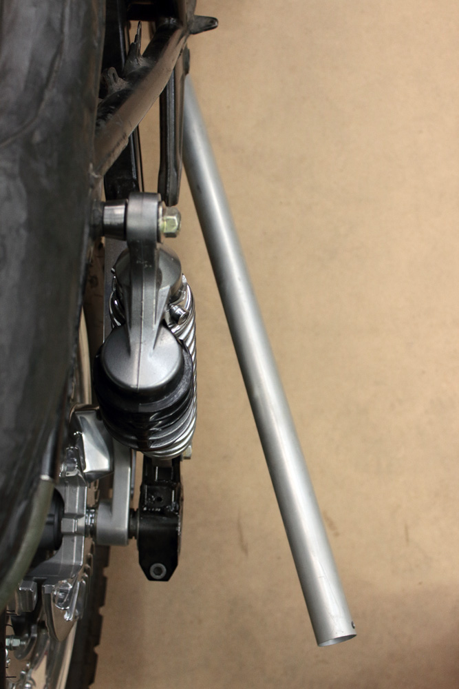The third, and the last point is if Zephyr 750 stainless steel downpipes are compatible with KZ650 mufflers. Since original KZ650 mufflers are factory welded to header pipes it means that those who ask the question are already running aftermarket mufflers, or are ready to do so. And here Zephyr Black Widow exhaust has a feature which everyone who wishes to install it on KZ650 has to consider for himself. The thing is outputs of downpipes have a pretty large outward sweep. To show what exactly I mean I fitted an aluminum pipe to the downpipes, so it’s a direct prolongation of the downpipes’ output pipe. The length of the aluminum pipe is around 640mm. Thus, you may see where straight mufflers would be pointed if you use them along with Black Widow exhaust header.