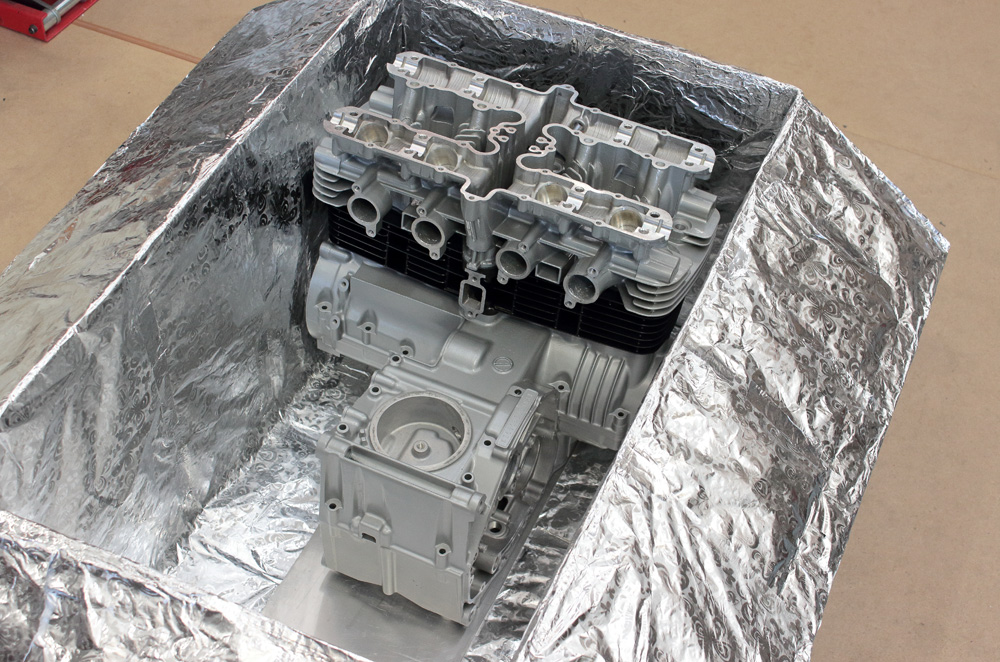 Now let’s proceed to the methods of engine baking. The method, being well known from various forums, is to bake engine and brake parts in kitchen ovens. But you may find from the same forums that this method may end up in some tension of relation between engine baker and his wife/girl-friend. And sure, not all of us like pizza with the smell of engine paint. As my garage is far from any kitchen oven, I from the beginning had to invent another method to bake the engine. I ended up with an ordinary cardboard box laid out from inside with two or three layers of cooking foil. I laid every layer in direction perpendicular to previous and with each strip of foil overlaying previous. I also use adhesive aluminum foil tape to fix every strip of foil here and there. In result cardboard is well isolated from the heat and thus never reaches ignition temperature even when parts inside of the box are heated up to 160-170C. As a heat source I use a heat gun. And this simple receipt definitely could call it “marriage savior”. Or “pizza savior”…