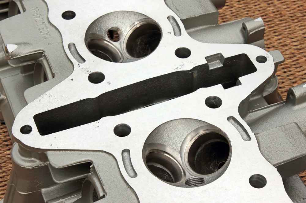 After baking I take cylinder head for resurfacing to the same specialized workshop that successfully bored and resurfaced cylinders for my KZ650. Even being new, the cylinder head had some “storage” warpage (around 0.06mm) and points of corrosion on the contact surface (effect of non-proper storage accomplished by the seller, Siegfried Spängler from Motorrad Spängler GmbH). We took 0.09mm from the cylinder head surface, so the cutter only touched intake valve seats. I could order to take another 0.05mm, but I decided to not go farther, even if some corrosion point still remained. My reasons were based on my expert judgment as follows: