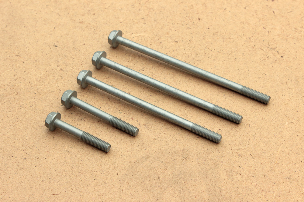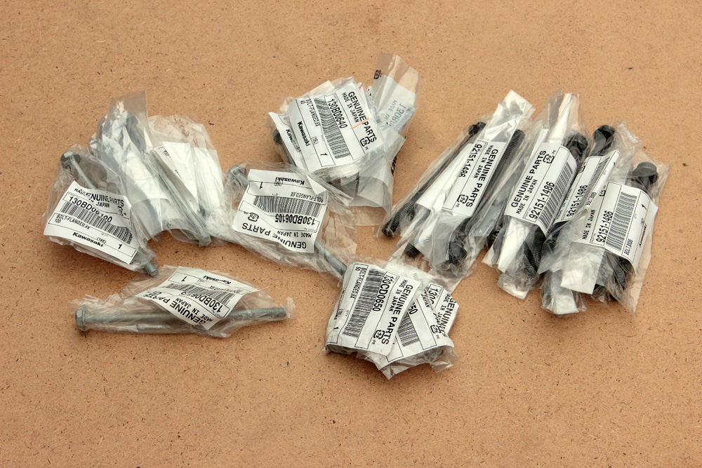 I returned bolts with defects of coating to the subcontractor and they redo the work. But at this stage I already had my mind full of doubts if I should use these bolts to assemble the engine. It’s easier to replace bolts that fix side covers or other parts of smaller significance. However it’s different for bolts that hold halves of crankcase together: especially for those that are in the crankshaft area and are to be tightened in specific sequence. So I ended up ordering a new OEM set of bolts. Since my goal is not restoration, I didn’t stick to bolts of early design. Instead I ordered a set of bolts from Kawasaki ZR7 which are interchangeable with KZ650 bolts. Here is complete set of them: