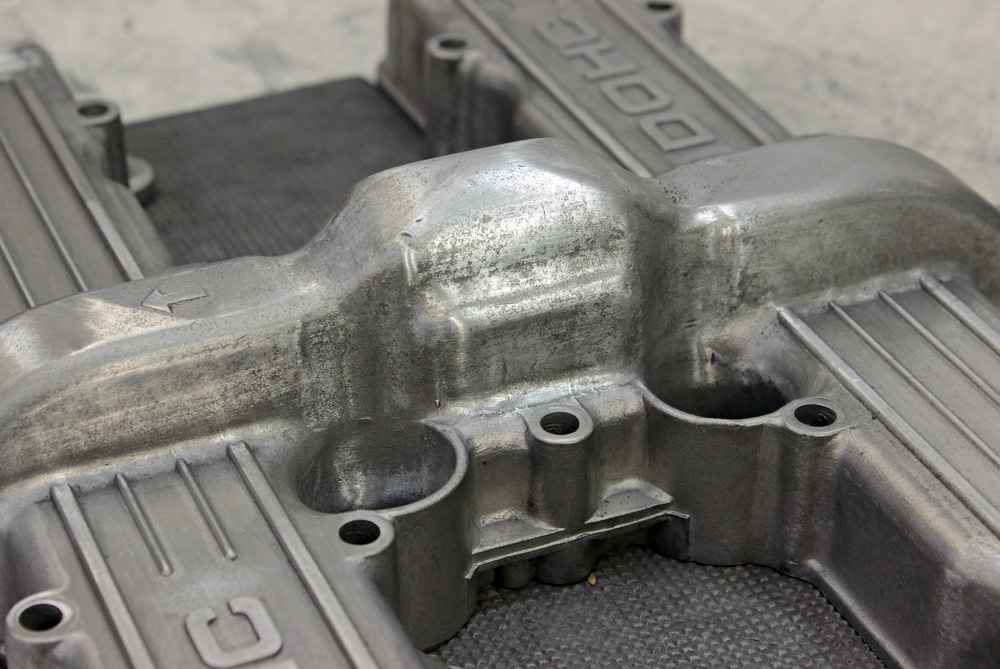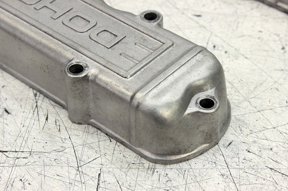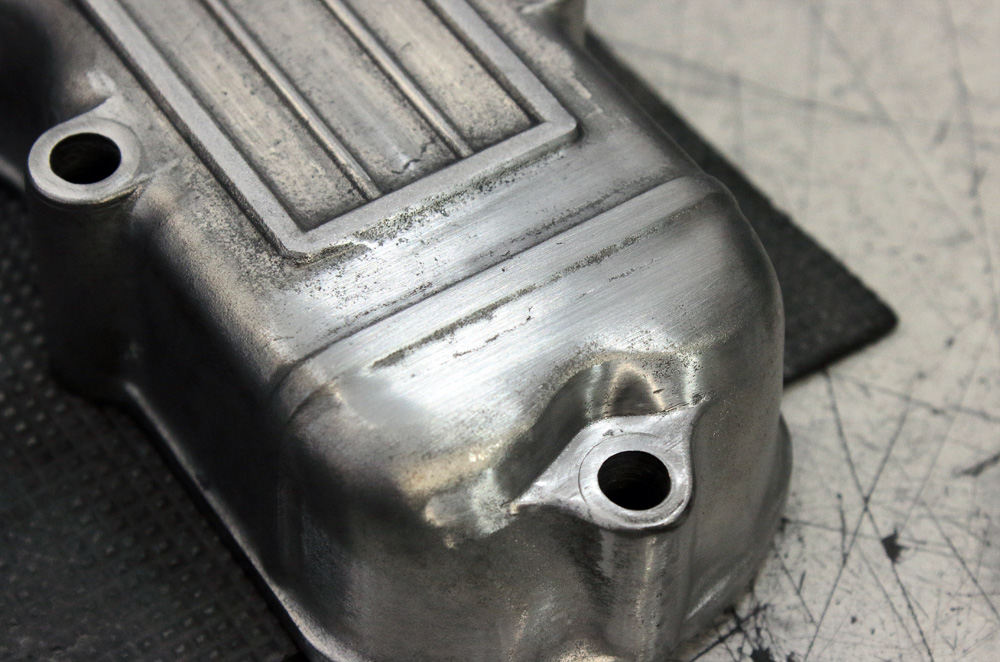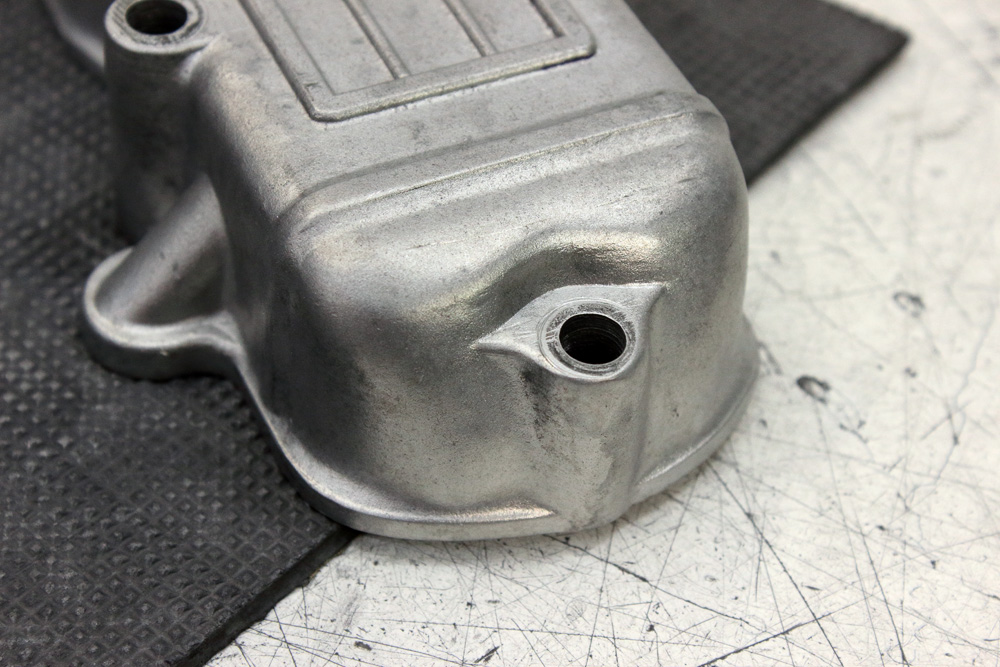 Before starting Kawasaki KZ650 engine assembling I have a couple of works to do. One of them is engine covers polishing. I want to get them ready so that after assembling the engine will be stored not only completely ready, but also sealed. And here is the first ready unit: valve cover. It is also the hardest cover to polish due to its configuration, design (which also includes DOHC lettering) and condition. It is a 40 years old cover which was in use for a long time, and was some time ago glass beads blasted. The casting of cover is accurate, but it never was intended to be polished, and unevenness of casting alloy didn’t make things easier. It took me a lot of effort and work to make the cover looks decently. To show you a contrast between “before” and “after” here is a couple of pairs of photos: