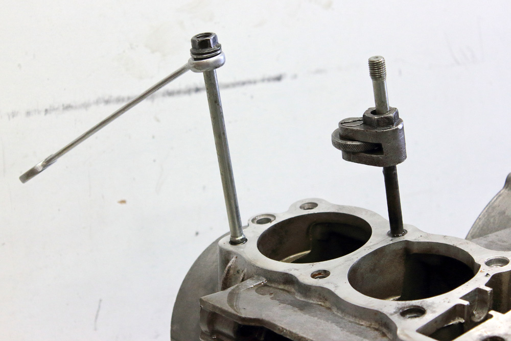 After I found out that high shouldered wheel’ rims that I ordered from Italy are not good enough for my project and was waiting for arrival of ordered substitute (this is another story), I concentrated my efforts on engine. I started from removing cylinder studs. Most of them had traces of corrosion, which is not a wonder for steel parts made some forty years ago. Initially I have intention to clean them and renew zinc plating, but studs seated in places very tight, so there was no chance to remove them undamaged. There are two general ways to remove studs: using two interlocked nuts and using special tool called “stud extractor tool”. Usually I prefer two interlocked high nuts, thus in result no thread, nor stud body is damaged. However, KZ650 stud thread is short even for two ordinary nuts and counting 40 years of sitting in aluminum this method allowed me to extract only two from twelve studs. All other studs I extracted with help of stud extractor.