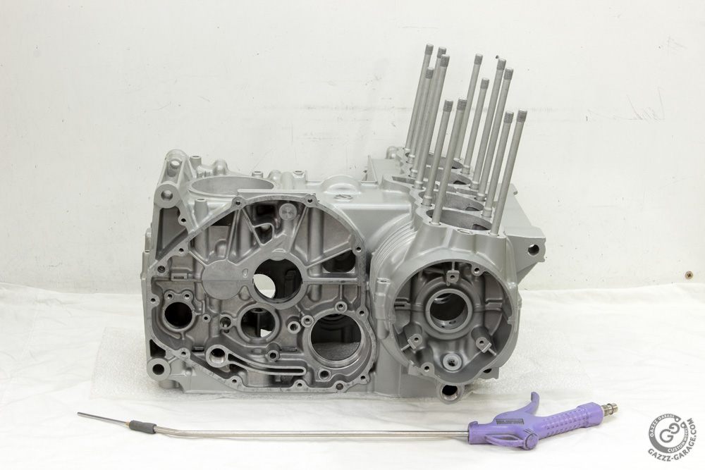 All threads of the Kawasaki KZ650 engine were cleaned with “special” bolts before glass beads blasting and painting. However, since I didn’t screw bolts into the alternator and ignition covers’ mount holes, I had to use it once more along with a section of remote control antenna (mounted to the nozzle of air gun).