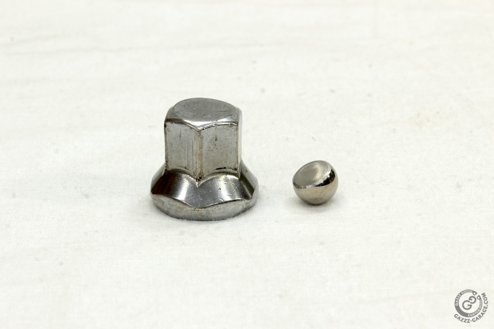 As for the special tool for cylinder head studs installation, receipt of non-OEM one is well known: original high cylinder head nut and bearing ball of suitable diameter. But there is a way to make it more reliable and here is my receipt of a special tool for installation of cylinder head studs. First, the ball has to go freely into the nut, but it has to be close to the internal diameter of the nut thread. So I found a ball of 8.7mm diameter and it fits the original KZ650 cylinder head nut perfectly. Then I grinded off about 1/3 of ball just like this: