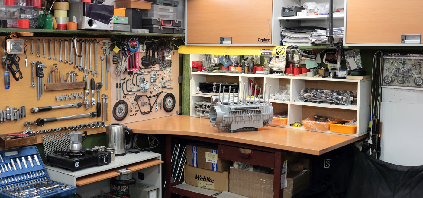 Thank you!So, everything was ready for Kawasaki KZ650 engine assembling . There are two workbenches in my garage, and one of them I designed according to my idea of comfort engine assembling. Here is how my engine assembling space looks like: