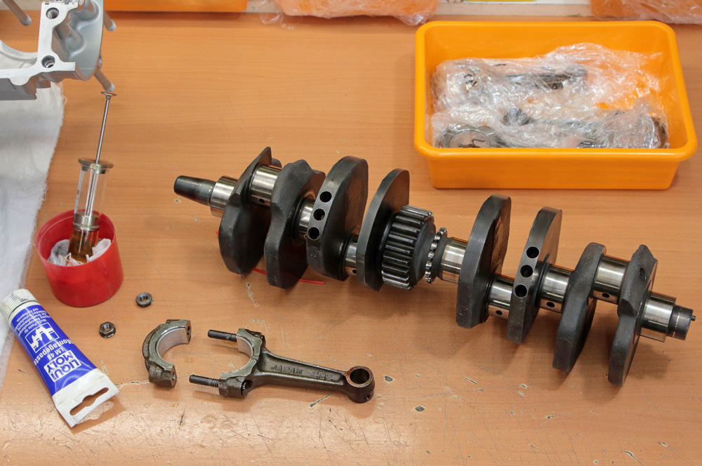 I tightened connecting rods’ nuts with the crankshaft installed in the upper half of cases. Then I returned the assembled crankshaft with conrods on the shelf for a short time.