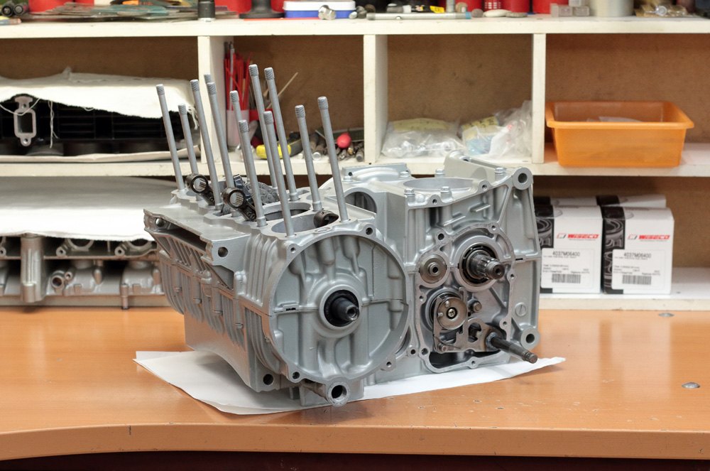 I had no time for photo shooting when I was applying sealant on crankcase contact surfaces. So next photos I took were those of the engine case already assembled, with all bolts torqued to specs.