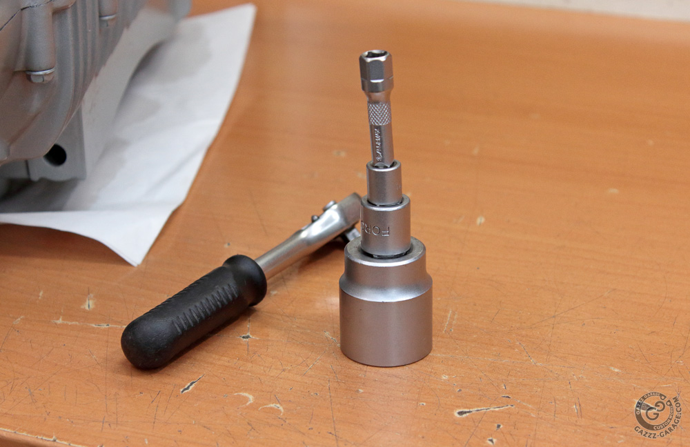 Next piece is about exhaust studs installation. I had at hand an M6 stainless steel connecting nut with one end securely welded. I equipped it with a spacer of appropriate length and a bearing ball of suitable diameter. In this way I got a “special tool” for M6 studs installation. It made the process of installing exhaust studs an easy thing: no thread wrecked and marks on the end of studs are similar to those one may find on factory installed studs.