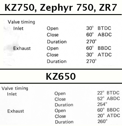 Then I checked information on valve timing in all available books on KZ650, KZ750, Zephyr 750 and ZR7. It turned out that KZ750, Zephyr 750 and ZR7 have identical valve timing specs. Here are screenshots of timing tables from Kawasaki Factory Service Manuals: