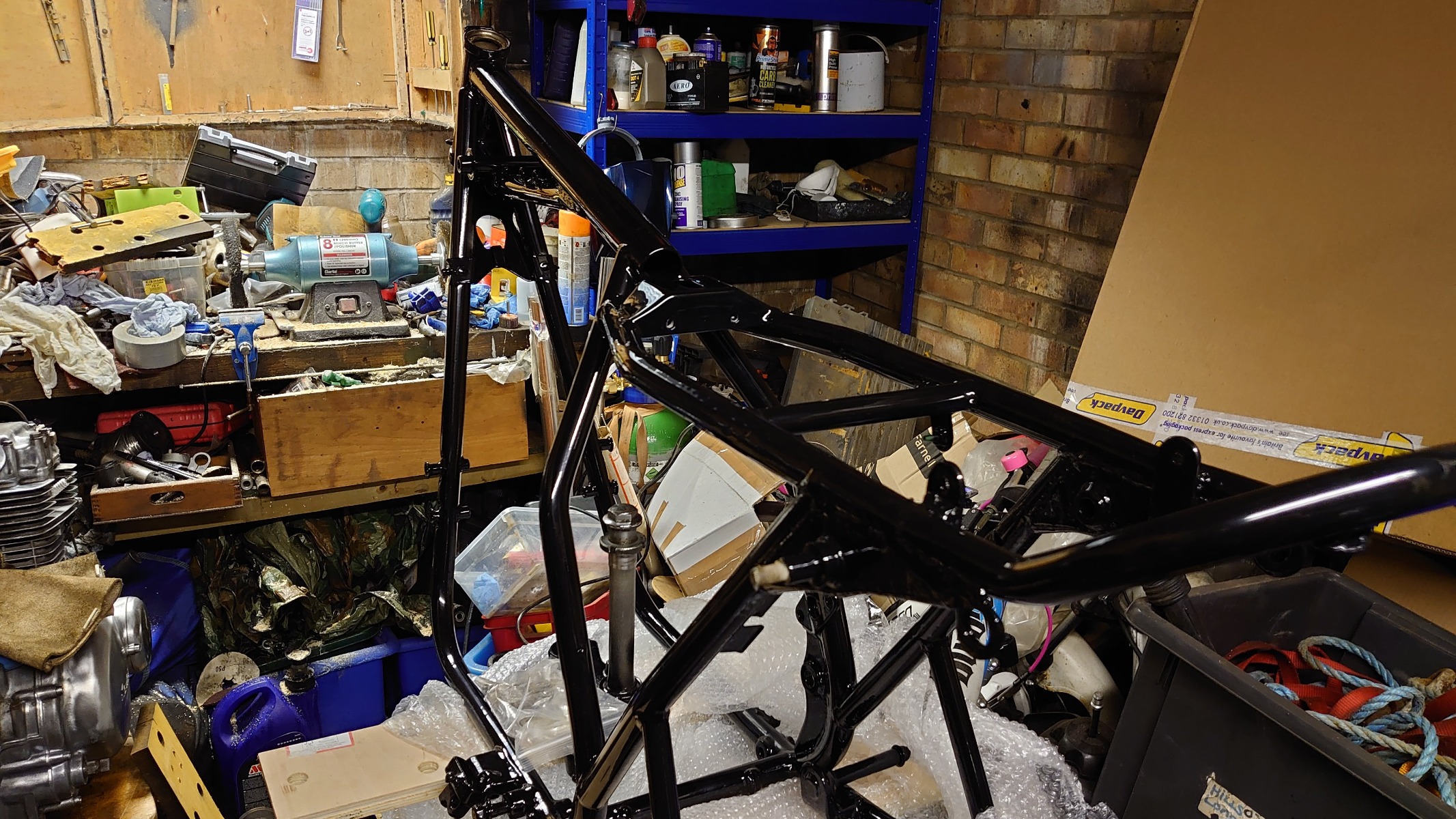 I've got the newly powder-coated frame back in the workshop, I'm very pleased with the finish, you can't see where the welds are.