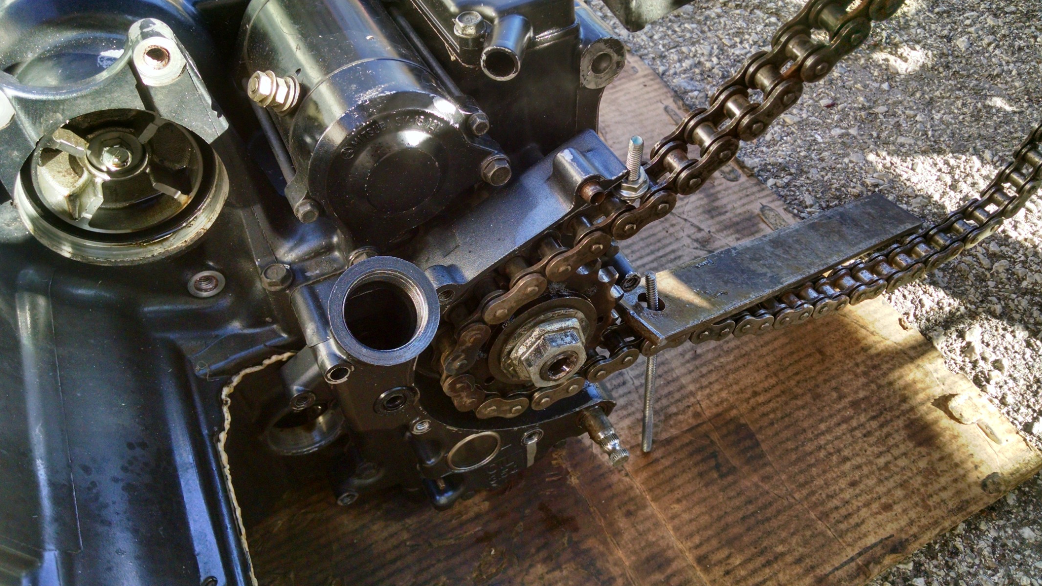 This motor either has stuff literally falling apart, OR bolts that will not come off without breaking something. I am having trouble getting the counter shaft sprocket nut off so I can disassemble the old engine. . First I tried to hold the sprocket with some 630 chain, not enough to put serious torque on so, it slipped when I added a cheater bar and some heat. Next, I moved the zx to the shed door and sat the engine behind it to try to hold the sprocket with the #50 chain that is on the bike. The largest bolt I can get through the #50 chain rollers is a 1/4" X 20 bolt with the threads ground off on 2 opposite sides to make it narrower. 1 bolt snapped with torque applied. All-thread is marginal at best, so I will buy some grade 5, 1/4" X 20 bolts alter today and try doubling and tripling up on the !/4" bolts until I get that nut off. hopefully without destroying it.