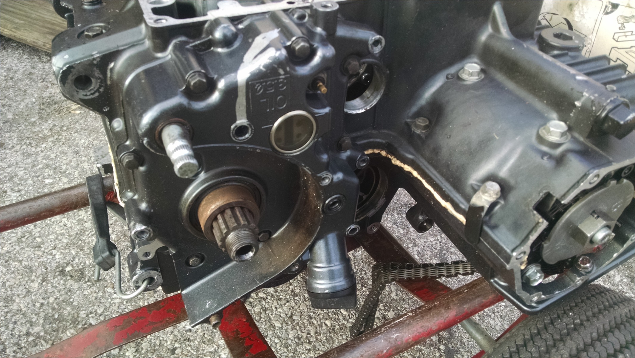I finally got the counter-shaft sprocket nut off of the original engine so disassembly can resume. I ended up removing the uni-strut shock and swing arm assembly to remove the chain so that I could use the chain to hold the sprocket for removal. My 2 wheeler had to replicate the frame to hold the engine steady enough to get the nut off.