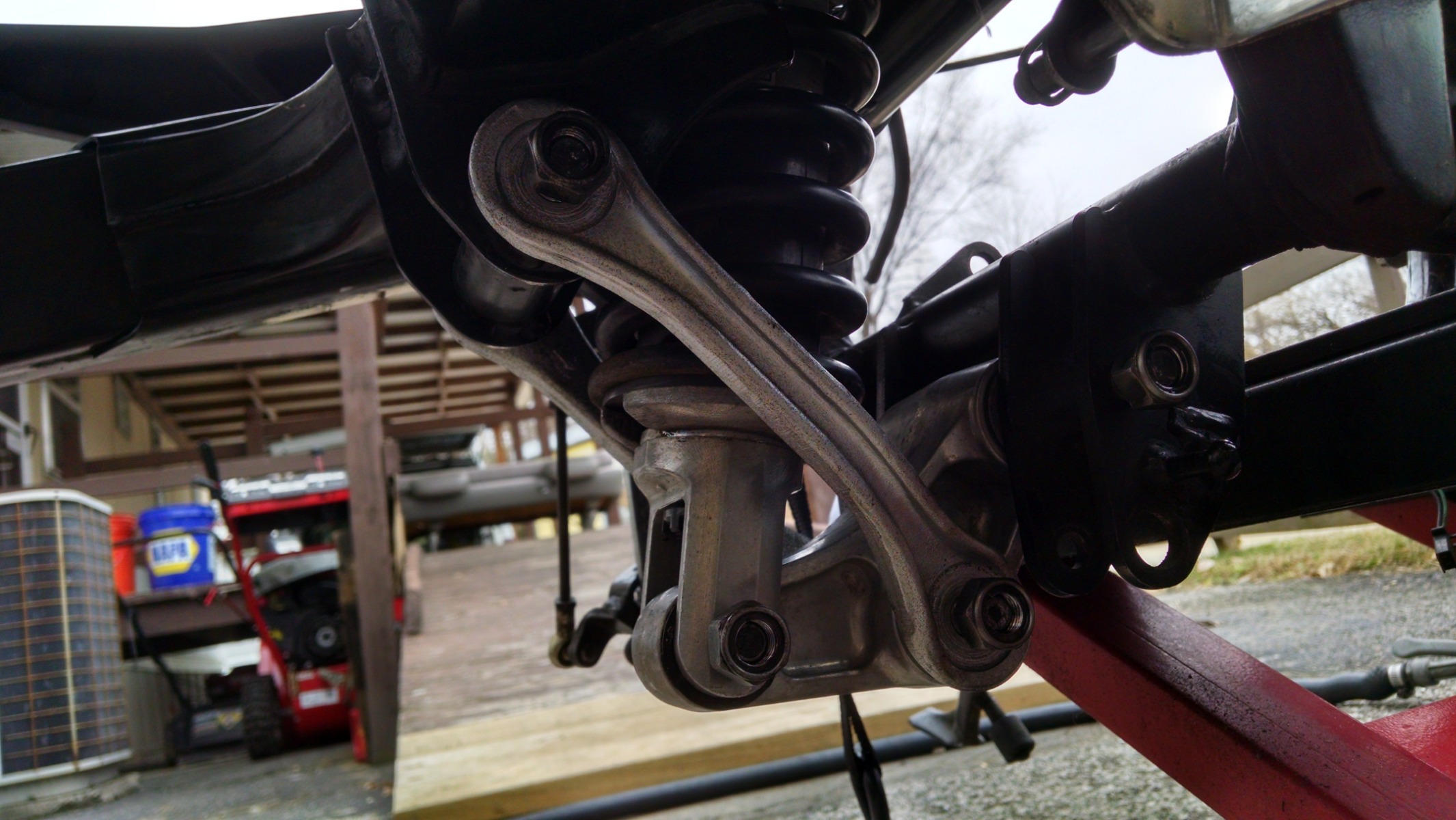 Painting / cleaning the shock linkage. The little 250 watt heater aids in paint drying on chilly days while keeping the shed at somewhat tolerable temps in the winter.