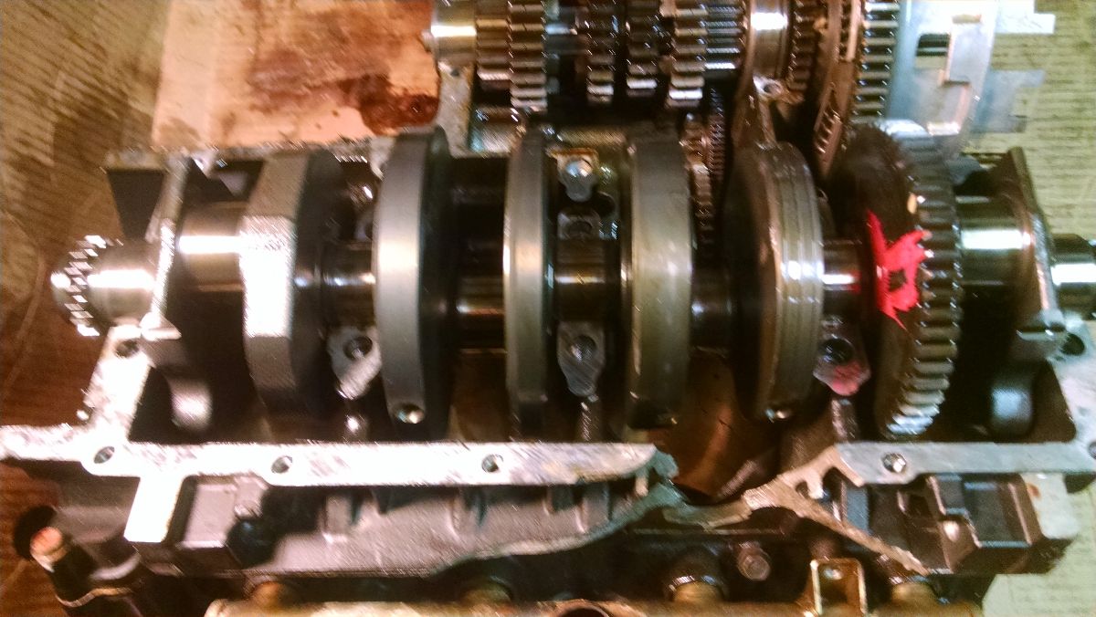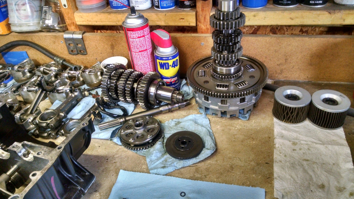 This is the clutch basket and 6 speed trans. There are 6 good pistons laying on the bench (taken yesterday) 3 good rods .The starter clutch is laying next to the alternator shaft.