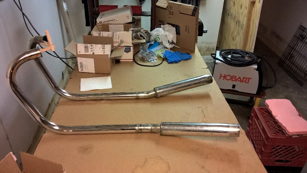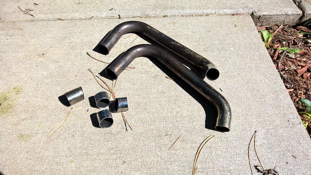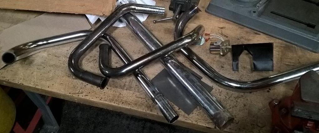 Here's the pile of pipes. Two factory headers (with extensions already welded on). Two crappy headers that came with the bike. And the aforementioned U-Haul table leg. We also used some conduit scraps from work that we salvaged, but they are not in the photo.