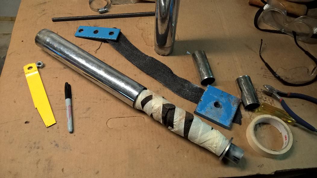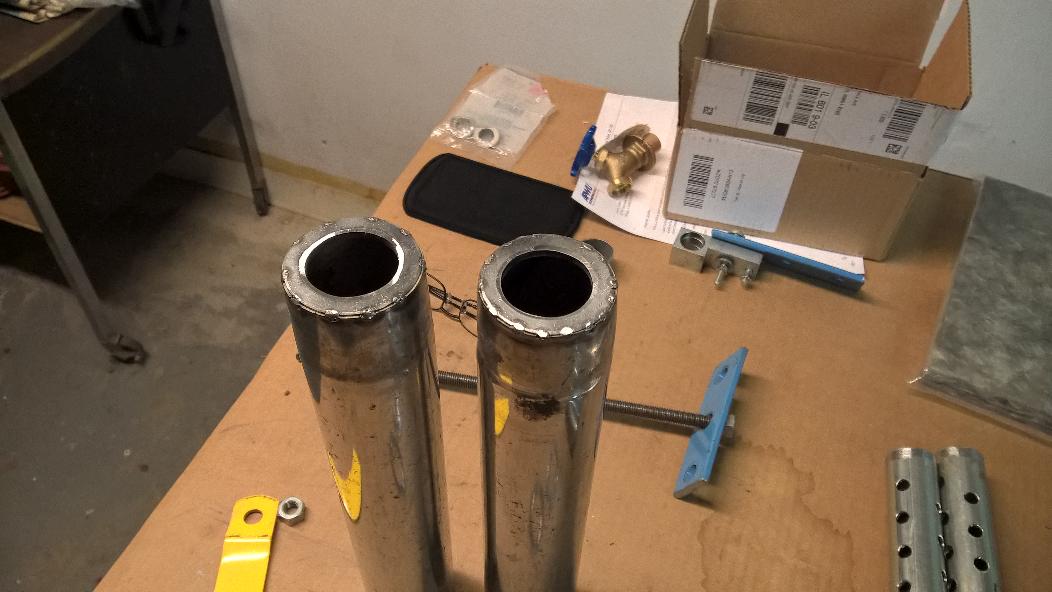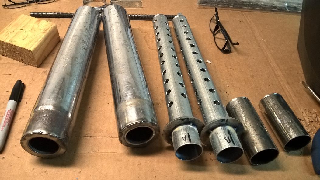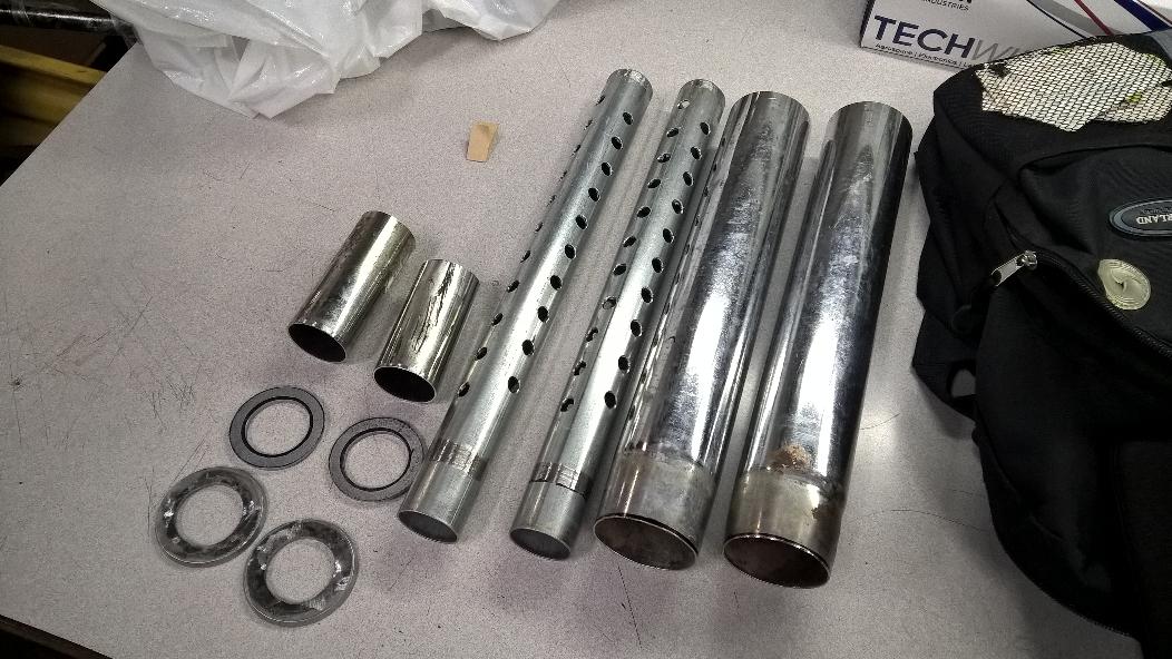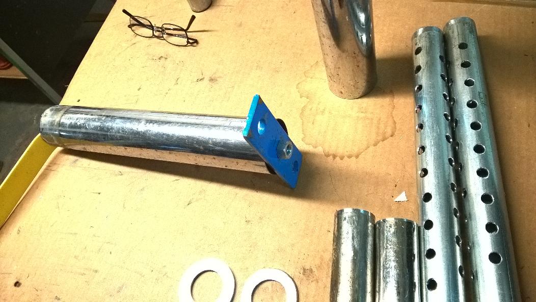 Here are some more extension pipes, inner-baffle conduit with holes, and the table leg cut in half to make the cannisters.