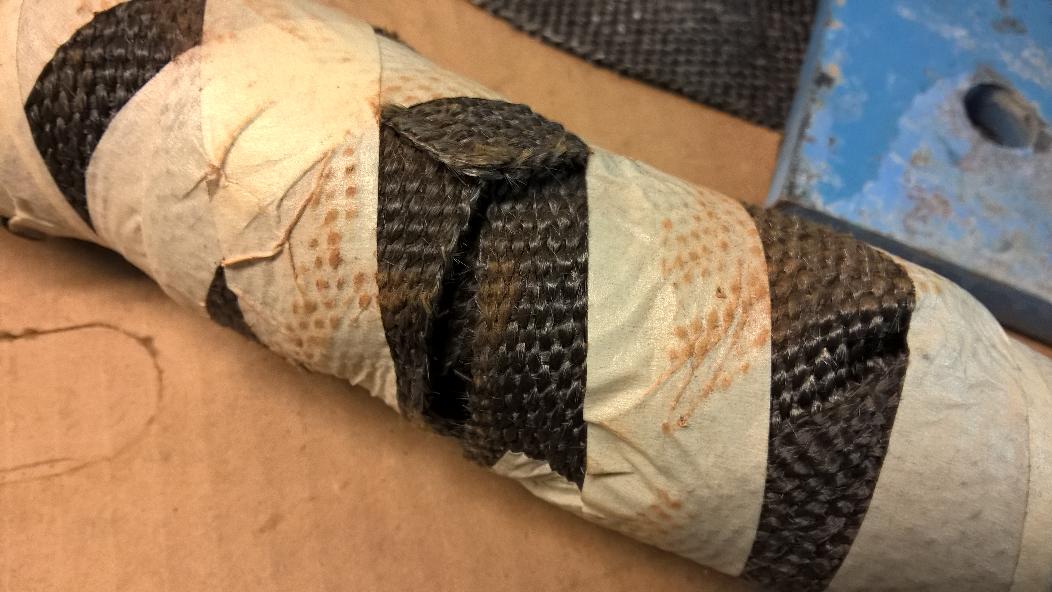 We didn't have any muffler packing, but we had a ton of that terrible fiberglass muffler wrap. I figured we should put something in the cannisters to reduce resonance, so I loosely used some wrap around the baffle pipe. The fiberglass dust got on everything. Ugghh. Not fun stuff.