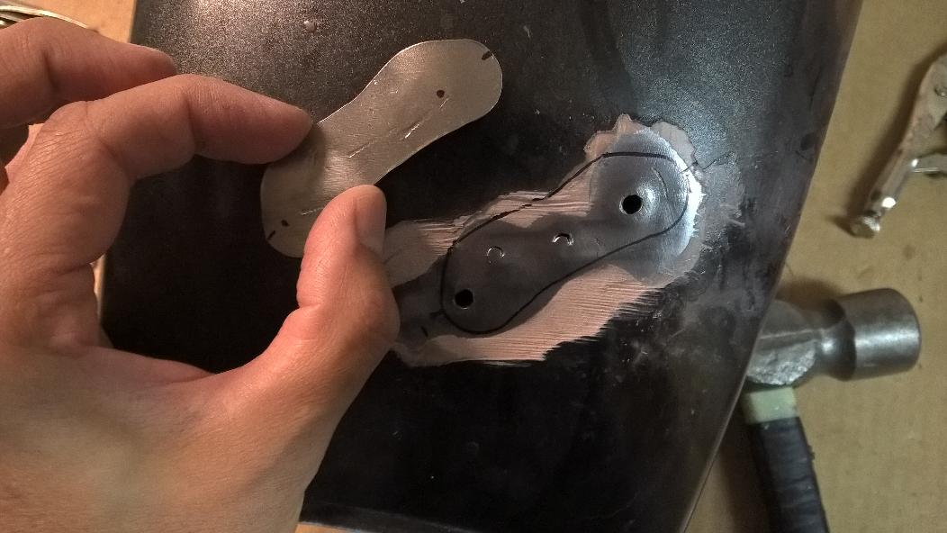 But because this is going to be temporary, and I want to try new things, I decided against soldering. I knew I would have to cover a large area which would require a lot of heat and the solder would contaminate the area against welding later. It's probably good that we decided against it as we found out later the area was so thin, there would have only been solder there with basically no steel.