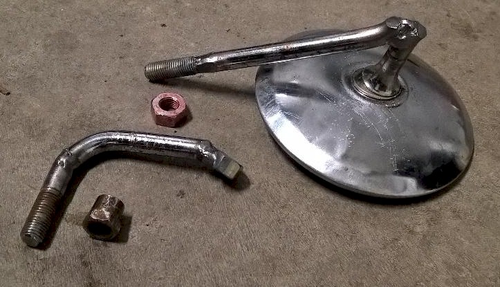 From the two bikes we had two different pairs of mirrors. Each pair had one good one and one bad one. So we took the best of the four and put it on the stocker D4. The other two, I thought were going into the dumpster. One was bent near the threads so the nut didn't turn properly and the other was frozen so it couldn't be adjusted. It was so frozen, the sheet metal on the back had buckled from people trying to move the mirror. So I came up with an idea to make them smaller and more easily adjustable.