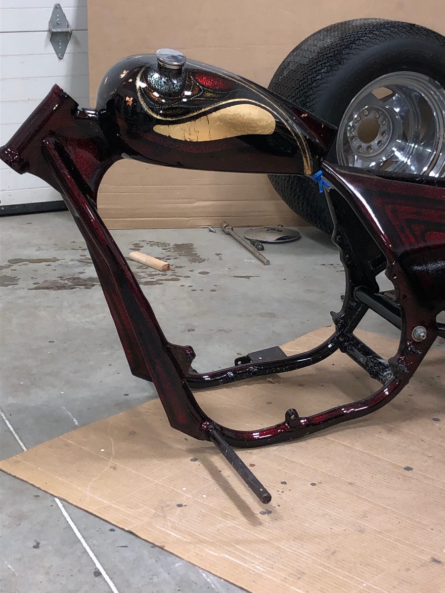 Got the ass end cleaned up and degreased. Gonna rattle can it for now and will polish/ chrome this winter.the topcoat is done! I have to weld a little more on my girder internal stops, the handlebars are about 2mm away from my beloved gas tank. ut she should be in a rolling chassis again soon. I am also thinking of assembling the bottom end, installing it,then finish motor assembly in frame.