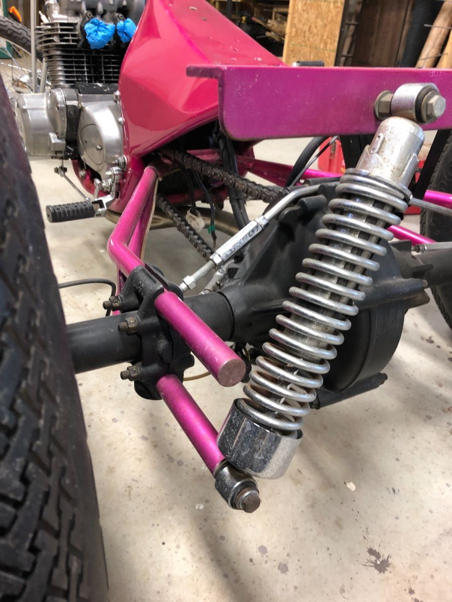 gotta track him or search the webs. I am making a rear reinforcement plate to help reduce twisting of the swingarm with the axle width at play.This will also be the new shock mount point on swingarm. Two shiny Mikunis barely sitting look nice though!